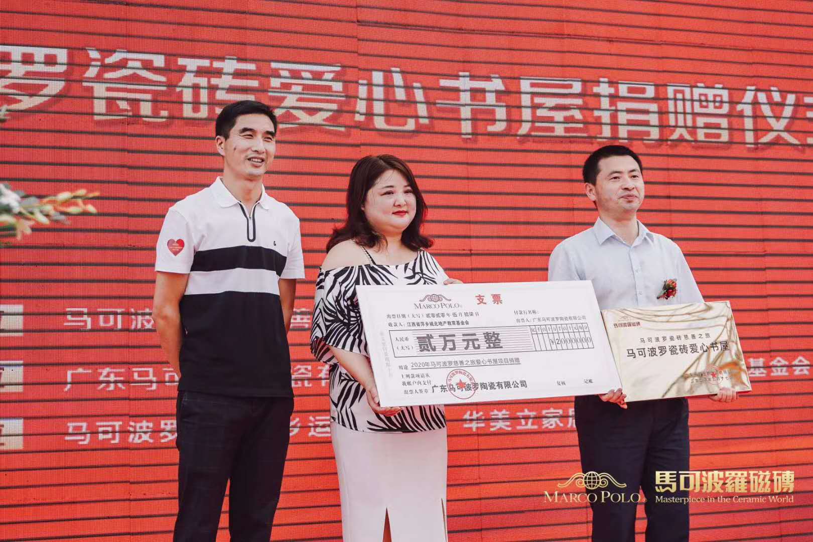 在超级品牌日期间,马可波罗瓷砖怀着感恩之心,回报社会,积极投身公益事业,在湖南浏阳、江西萍乡、鄂尔多斯等地先后举办马可波罗慈善之旅,捐资助学,建设马可波罗爱心书屋。点滴爱心汇聚成暖流,解决贫困学子的困难,为他们的梦想插上翅膀。截至目前,马可波罗爱心慈善基金累积捐助善款已达2757万元。