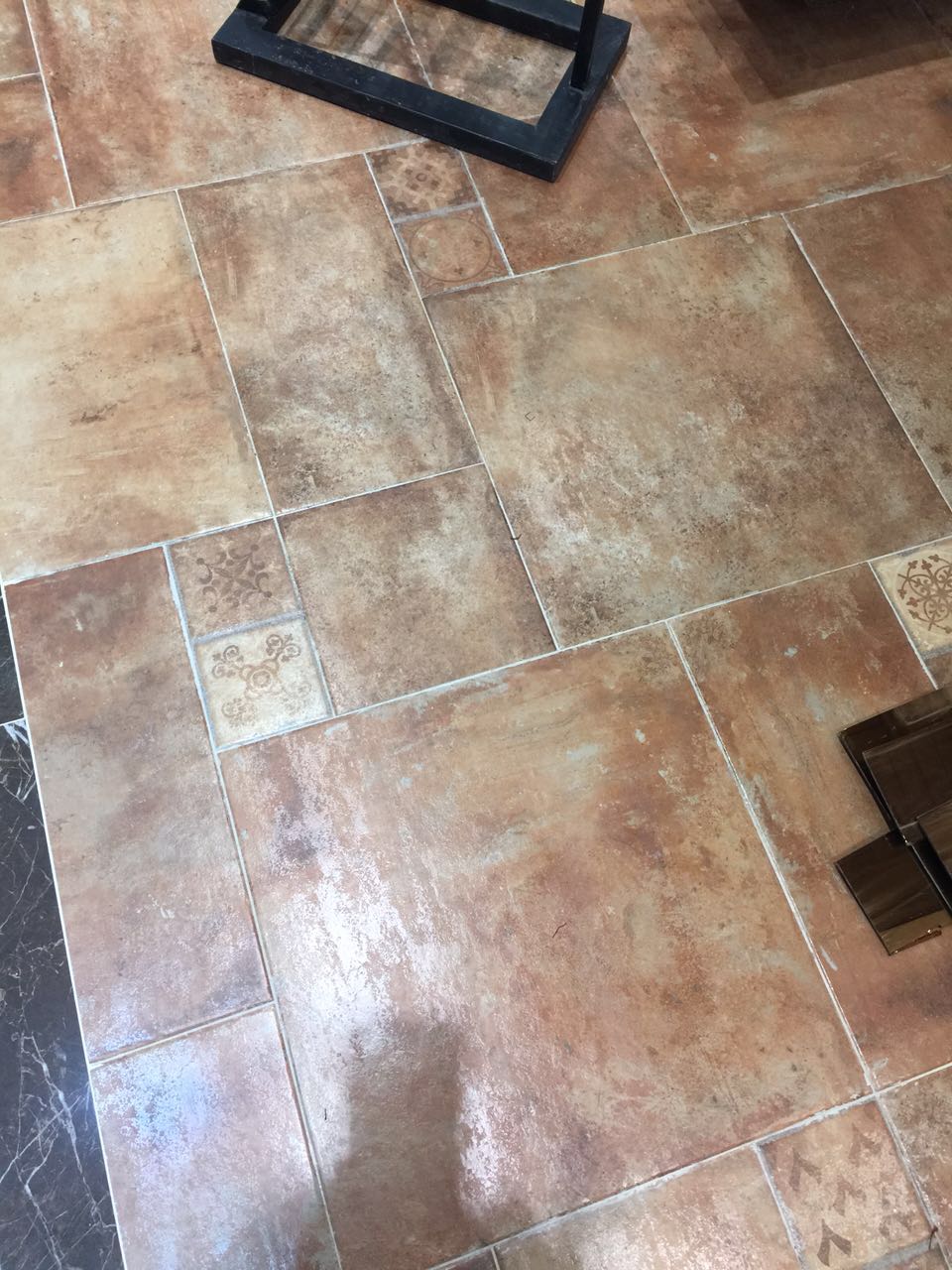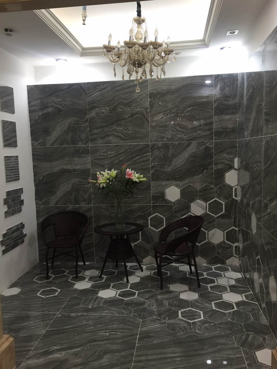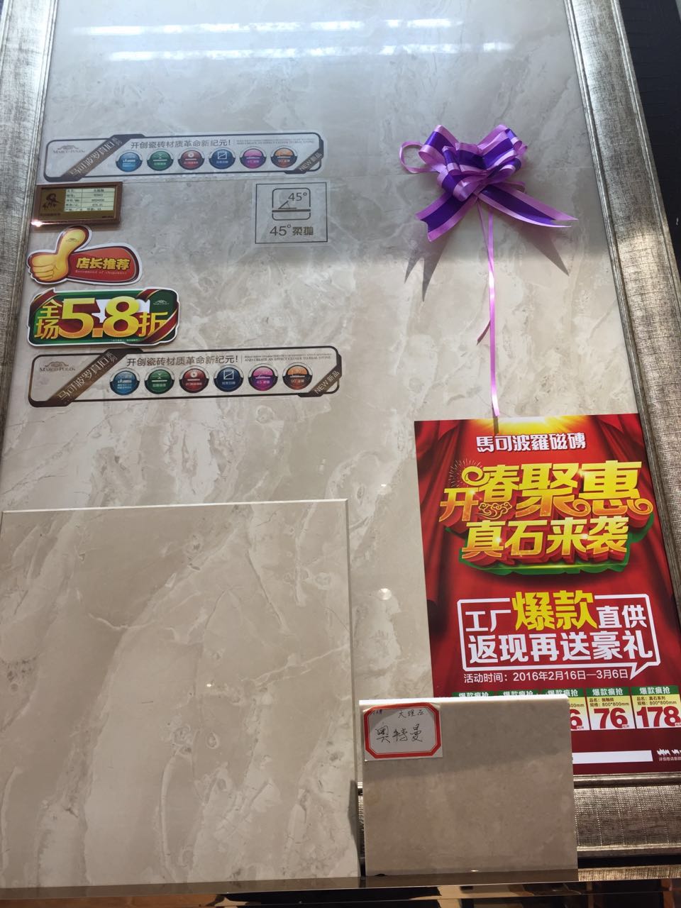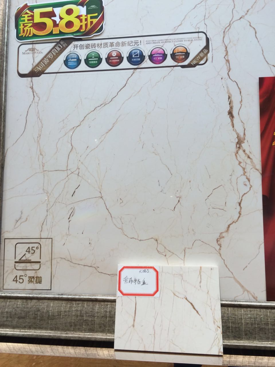 除了新品上样工作以外,南京马可波罗还提前开始了新品的推广,12月20日,南京举办大库集采活动,在汤国珉的指示下,特在现场布置了2016年新品专区,并针对2016新品真石系列通体的最大卖点,将瓷砖加工成小块进行倒角磨圆,同时在大理石厂选购了同样的品种和真石瓷砖进行对比。
