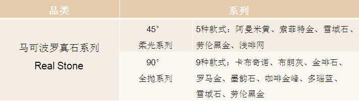 马可波罗瓷砖真石系列拥有更多的色彩表现,能满足不同人群的审美需求,搭配不同的装修风格,适用不同的空间格局。为方便观看,小编把14种款式整理成表,请看下面: