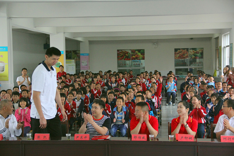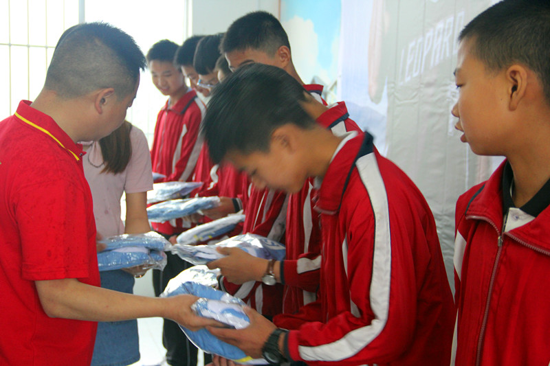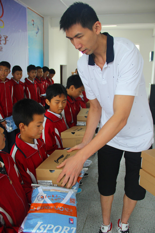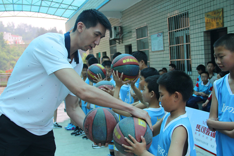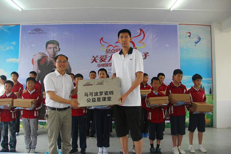 CBA深圳马可波罗队球星张凯和竹溪马可波罗瓷砖邵总为爱好篮球运动的同学们送上篮球、球衣、球鞋等专业装备作为儿童节礼物。
