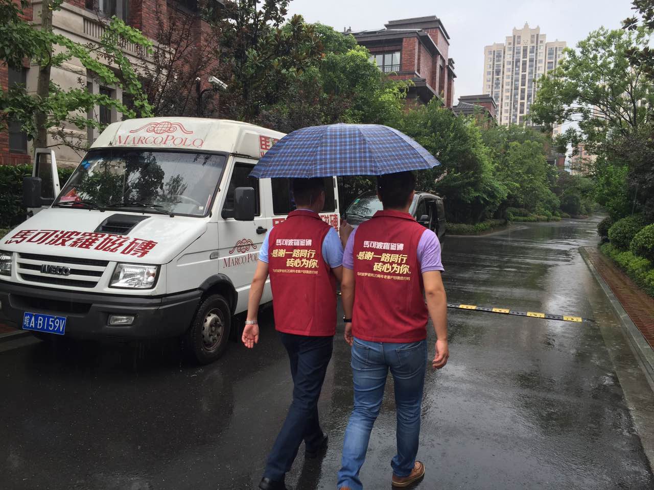 漫天大雨也阻挡不了马可波罗瓷砖工作人员上门为客户服务的决心