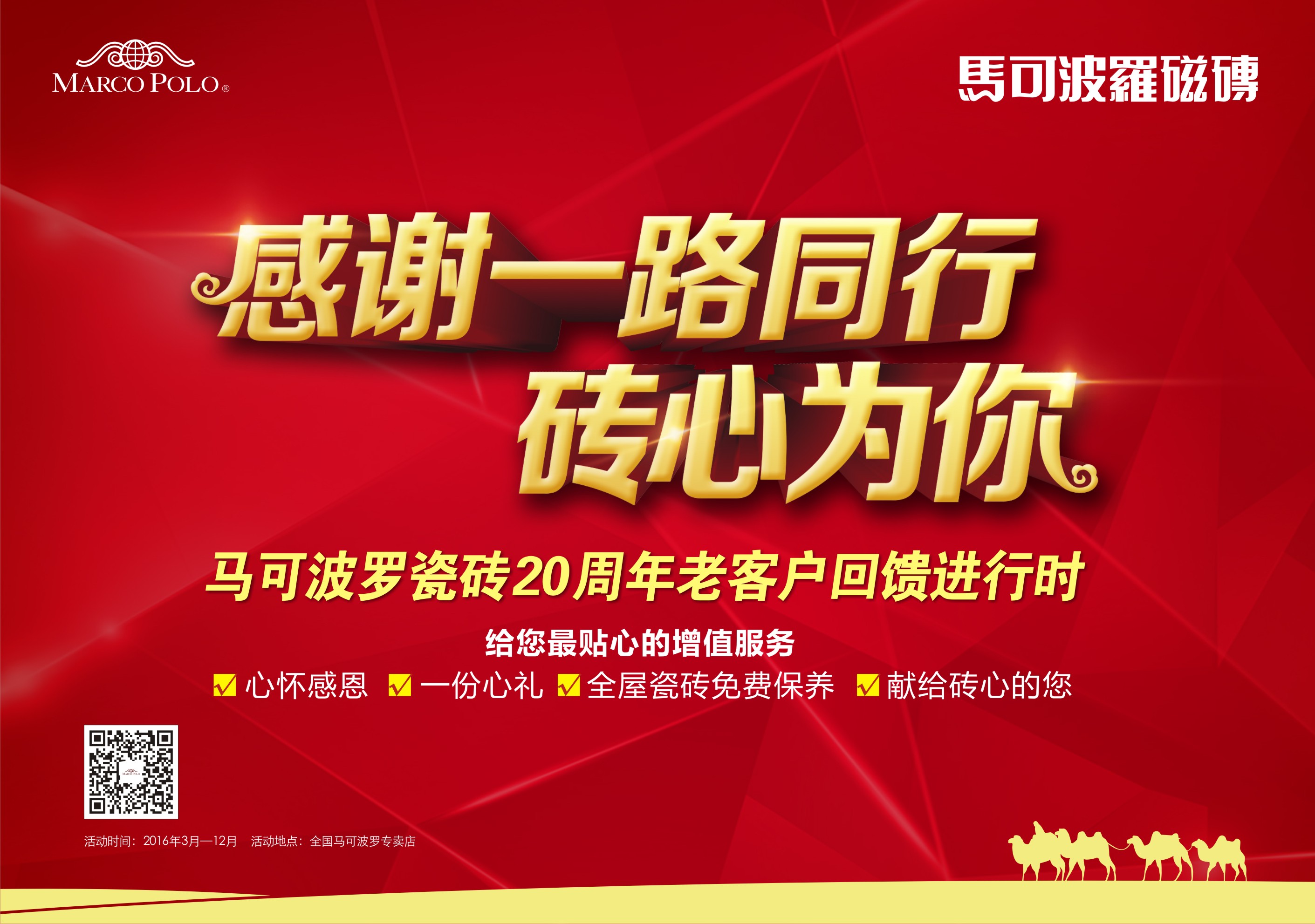 马可波罗品牌本着以用户为本、专一做砖的理念一路风雨兼程走过了20个年头,20年里,因为有数以万计的消费者对马可波罗瓷砖品质和服务的认可,所以才有今天的马可波罗。值此品牌成立20周年之际,马可波罗瓷砖开展20周年老客户回访活动,以表达对长期支持马可波罗瓷砖的消费者的诚挚谢意和衷心祝福!