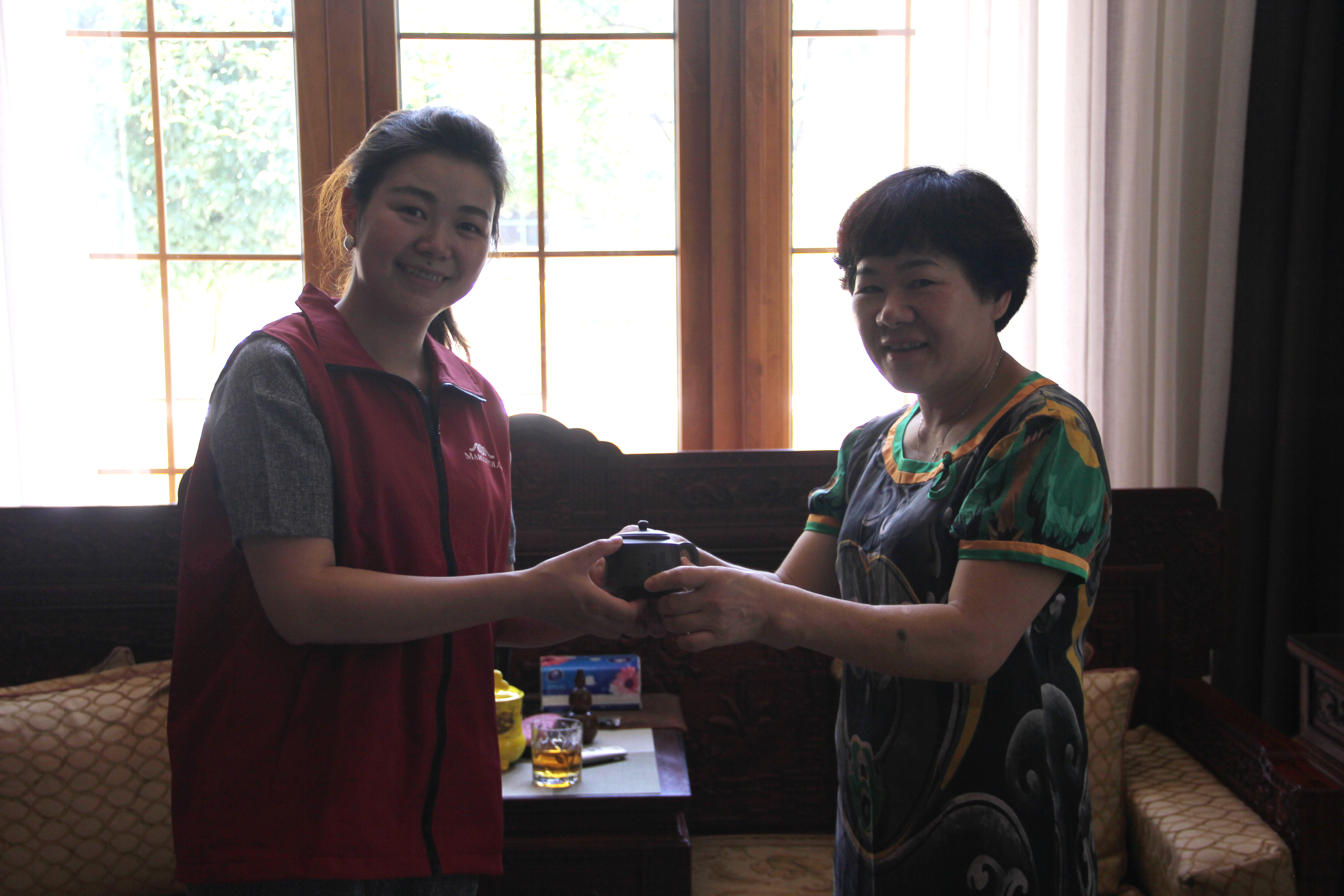 最后,我们将马可波罗瓷砖20周年老客户回馈定制壶送给爱喝茶的叔叔,并且将一盆君子兰送给爱花的阿姨。