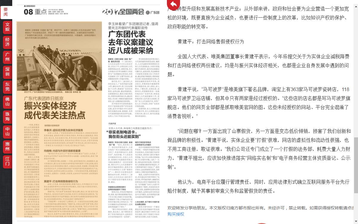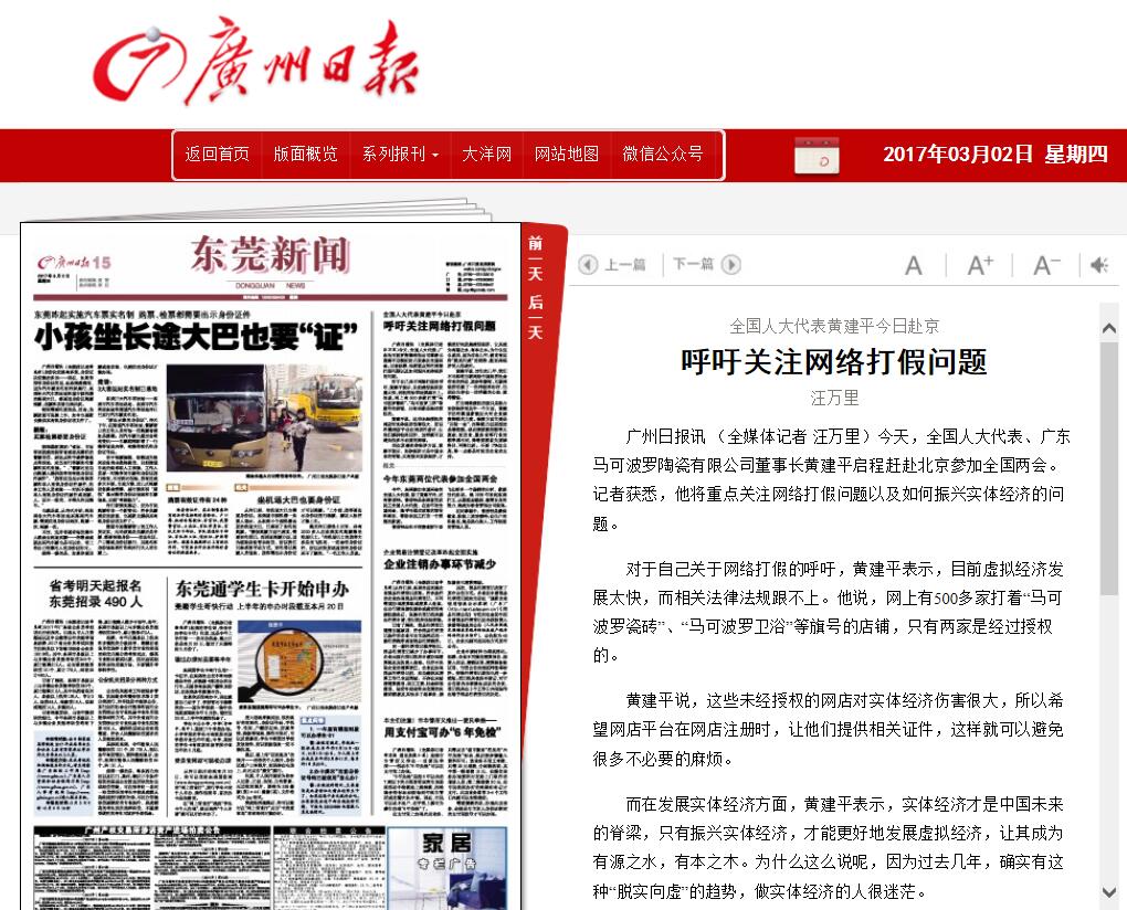 明天3月5日,第十二届全国人大五次会议将正式开幕。作为建陶行业唯一的全国人大代表,马可波罗瓷砖董事长黄建平已赴京参会。2017年董事长黄建平关于“打击网络售假侵权”的议案,已先期引起诸多关注,各媒体争相报道!