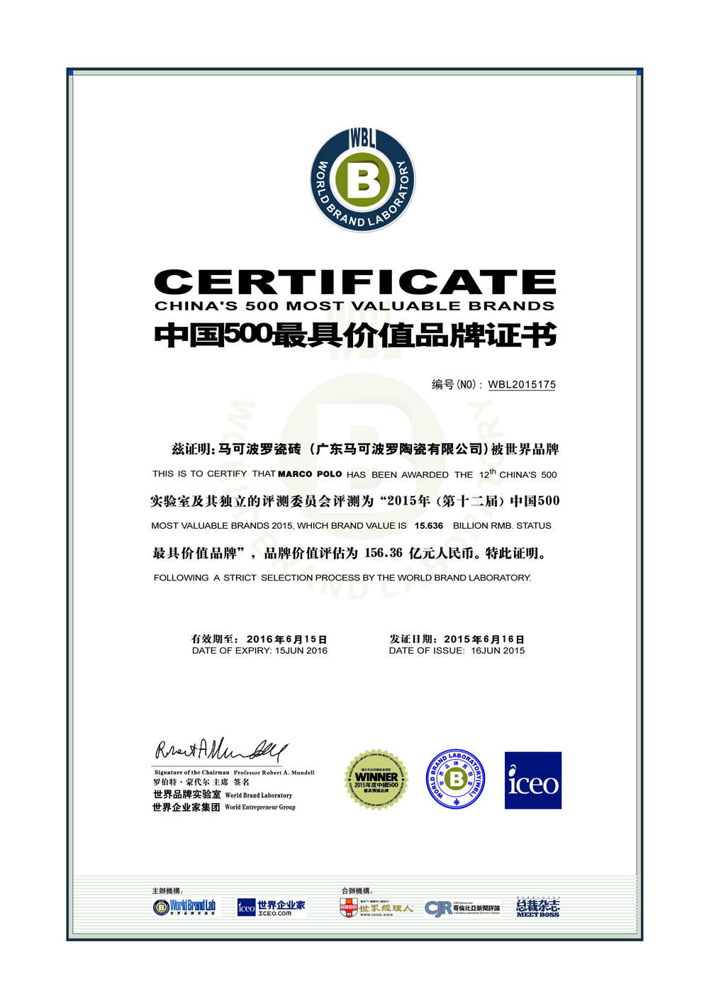 2015年6月16日,北京,世界品牌实验室(World Brand Lab)发布了2015年(第十二届)《中国500最具价值品牌》排行榜,2015年马可波罗瓷砖品牌价值达156.36亿。