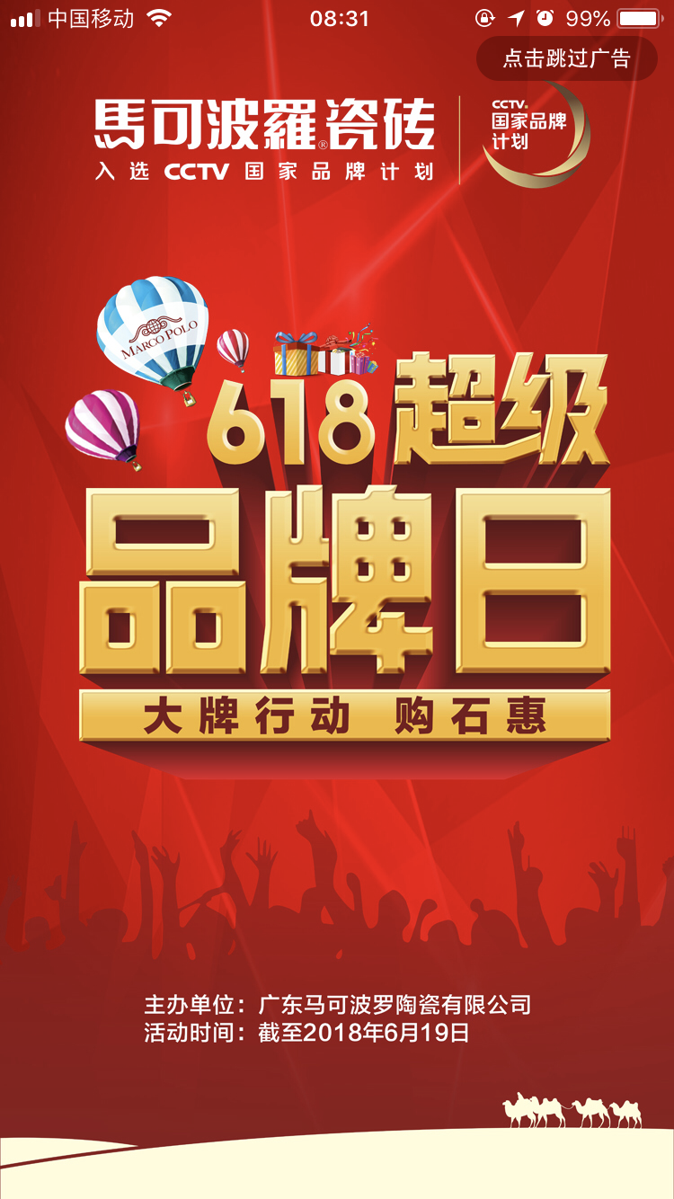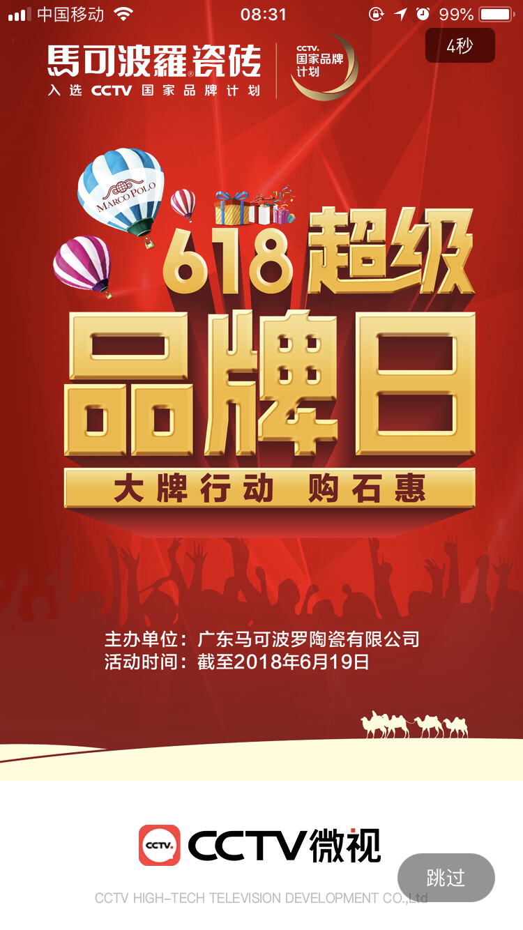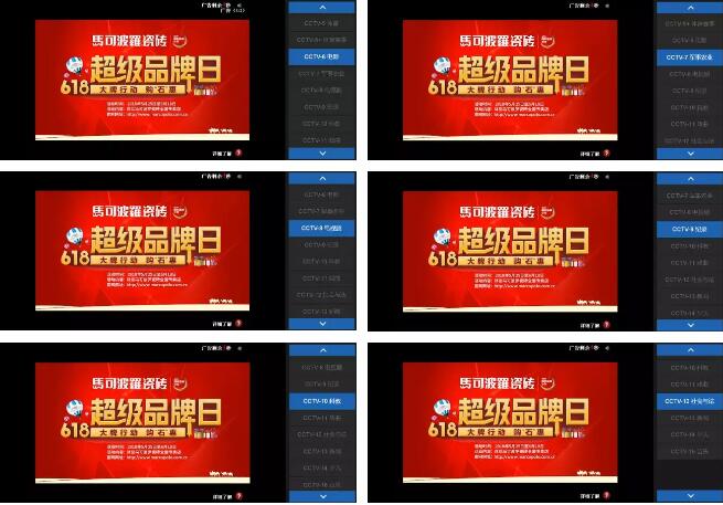 自5月30日起,马可波罗瓷砖“618超级品牌日”全新品牌形象宣传片陆续登陆中央电视台各频道,在《焦点访谈》、《经济信息联播》、《东方时空》等王牌栏目前后滚动播出。