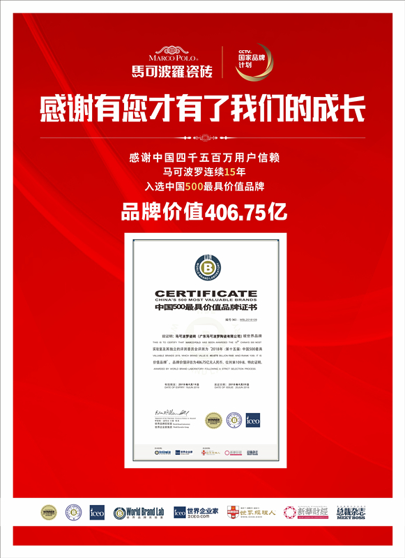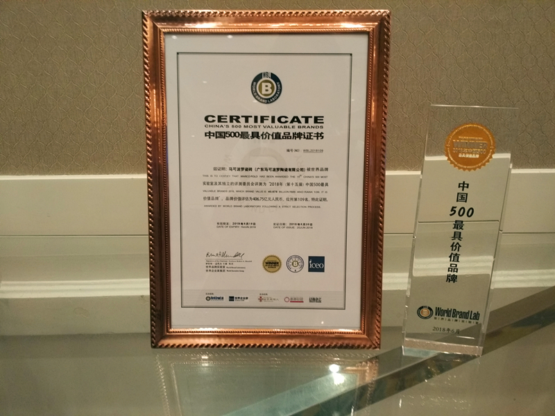 6月20日,全球三大品牌价值评估机构之一——世界品牌实验室在京揭晓“2018年中国500最具价值品牌”榜单,马可波罗瓷砖以406.75亿品牌价值,名列榜单第109位。