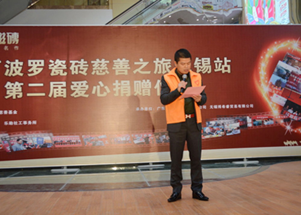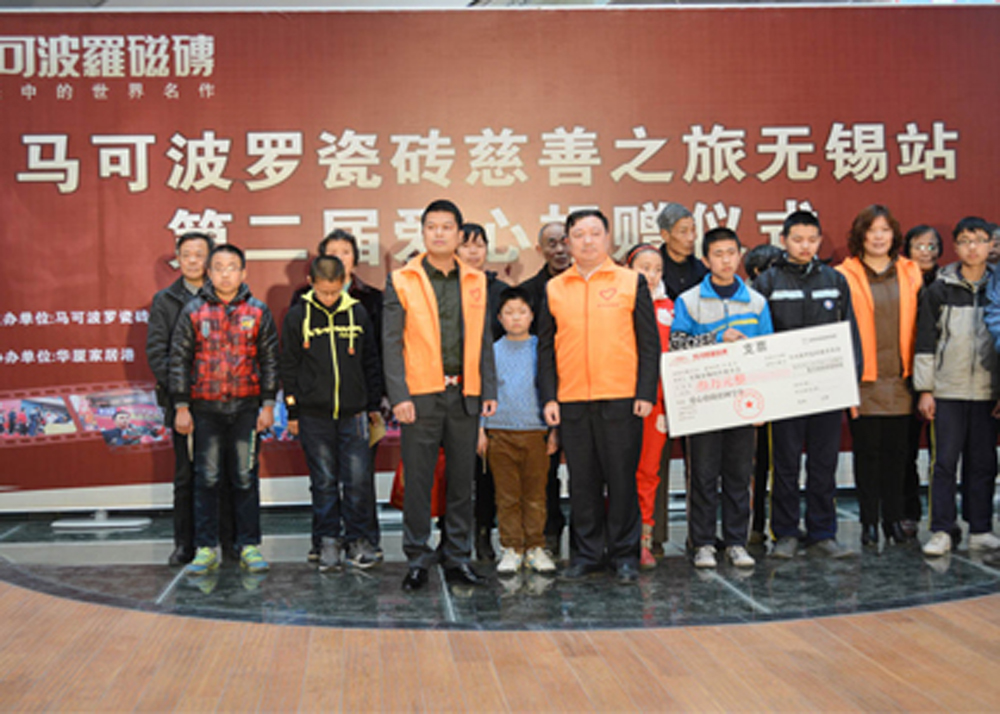 2014年3月15日马可波罗瓷砖慈善之旅再一次来到无锡,捐赠仪式现场无锡马可波罗同样捐赠3万元,为20位贫困的学子们献上一份爱心。届时无锡马可波罗瓷砖总经理朱廷树先生发表重要讲话,表示会一直坚持做好每一份慈善事业,会一直带领无锡马可波罗瓷砖将爱进行到底,用无锡马可波罗瓷砖的小爱换取大家的大爱,希望无锡马可波罗的这次善举可以吸引更多的人来关注我们的贫困学生,让他们能够健康快乐地成长;与此同时,无锡华厦家居港副总经理、财务总监、无锡华厦家居港爱心基金会会长杜慧增女士也发表了重要讲话,杜总在讲话中表示会一如既往支持无锡马可波罗瓷砖的慈善之旅,她将会带领她的团队集体向无锡马可波罗的家人们学习,会协助无锡马可波罗波罗一起做好每一份善举。