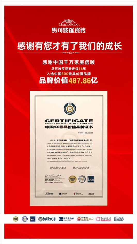 6月26日,由世界品牌实验室(World Brand Lab)主办的第十六届“世界品牌大会”在京举行,会上发布2019年“中国500最具价值品牌”榜单,马可波罗瓷砖品牌价值达487.86亿,名列榜单107位。