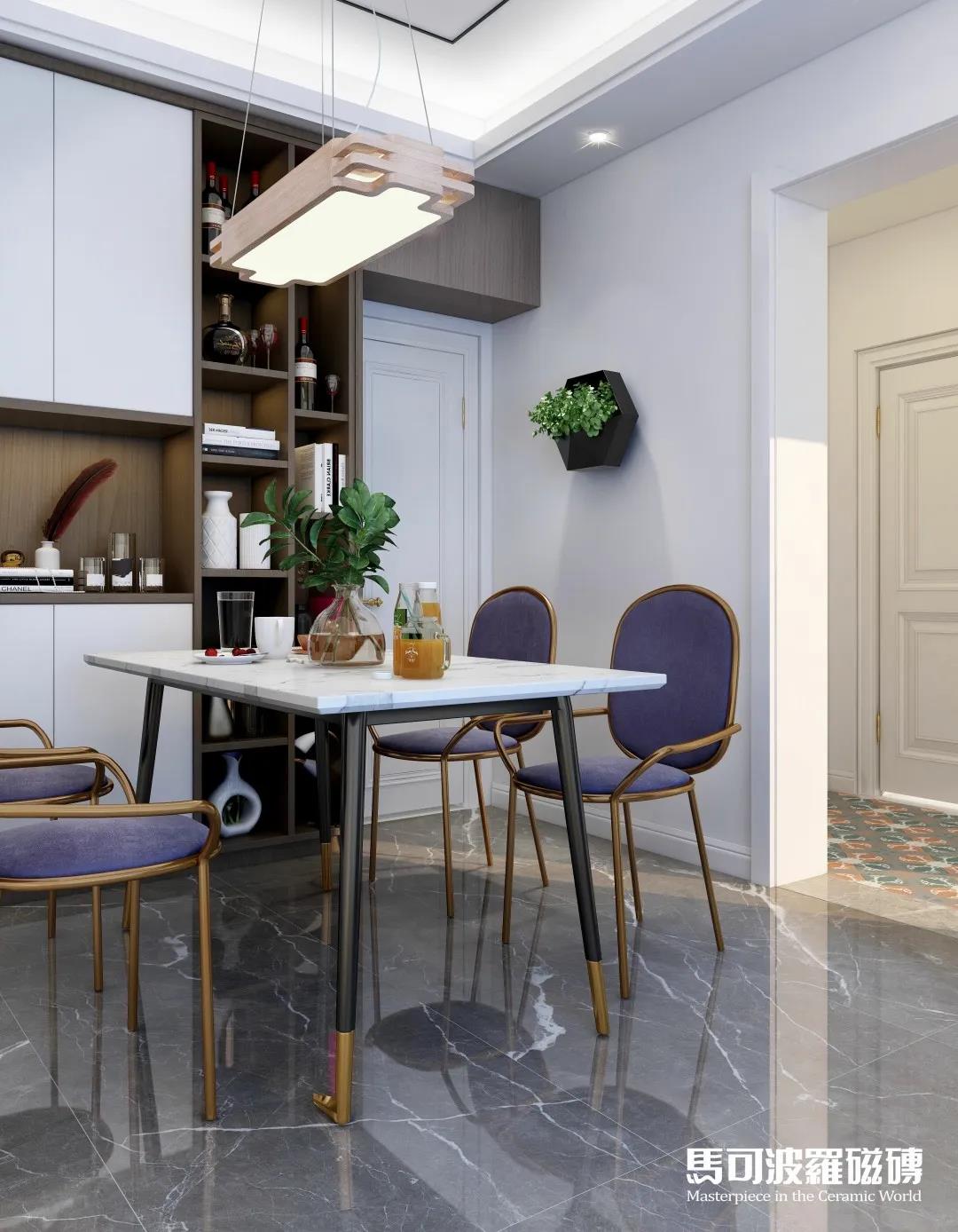 线条分明的家具时尚感十足,而如云雾般蔓延开来的瓷砖纹理则仿佛为空间蒙上一缕薄纱,令简约设计也独具诗情画意。
