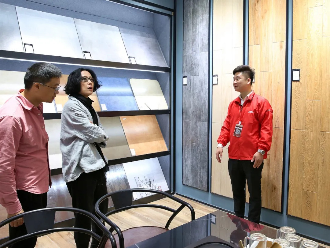 ▲ 设计师何潇宁老师进店体验马可波罗瓷砖卓越品质