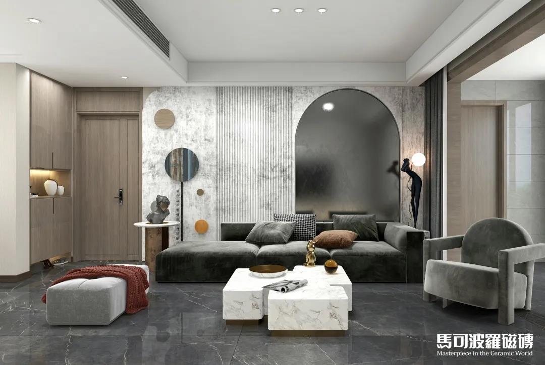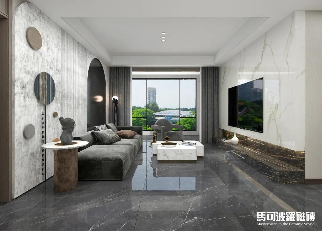 客厅采用黑白灰经典配色,马可波罗岩板极品阿玛尼所铺贴的地面,与电视背景墙所采用的鱼肚金形成反差,赋予空间更丰富的层次感。