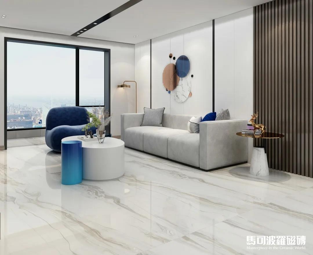 本案中,空间以白色为主色调,整体家装布置简洁又不失时尚。客厅地面采用马可波罗岩板欧比科岩,简约纹理大气自然,质感细腻高贵典雅。