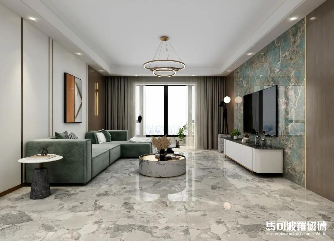 低饱和度的青绿色沙发与电视背景墙的马可波罗岩板亚马逊绿呼应,为客厅笼罩上一层清新舒适的自然基调。