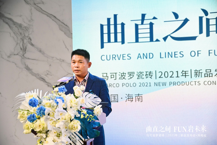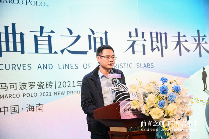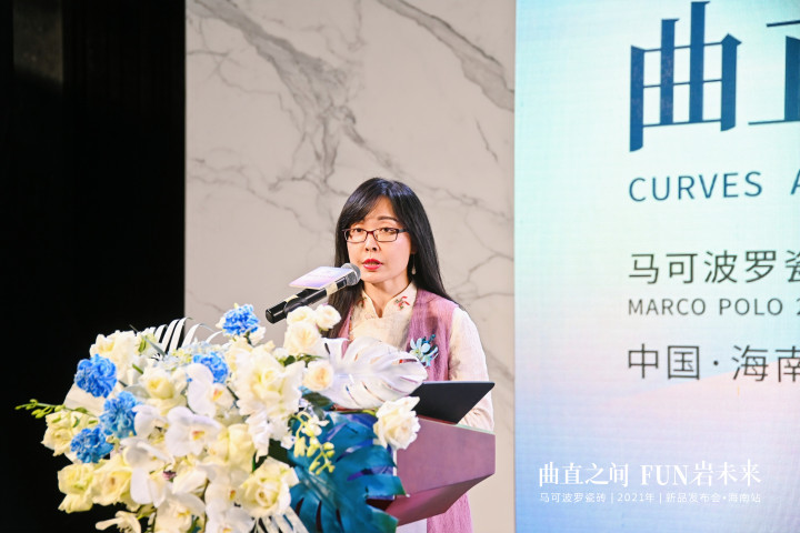 海南省室内装饰协会秘书长王抒上台致辞,代表海南省室内装饰行业协会向马可波罗瓷砖2021年新品发布会的成功举办表示祝贺。同时表示,马可波罗瓷砖无论是品牌,还是产品,亦或团队服务都深入人心,得到了广大消费者的好评。