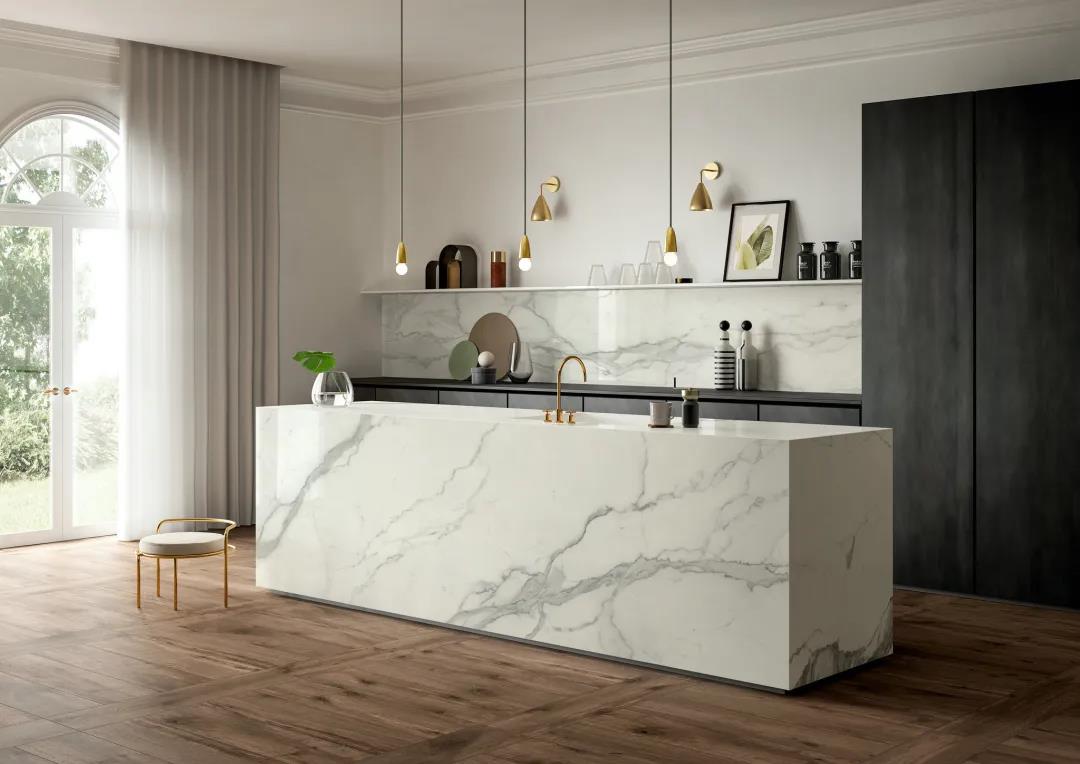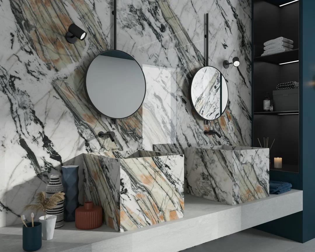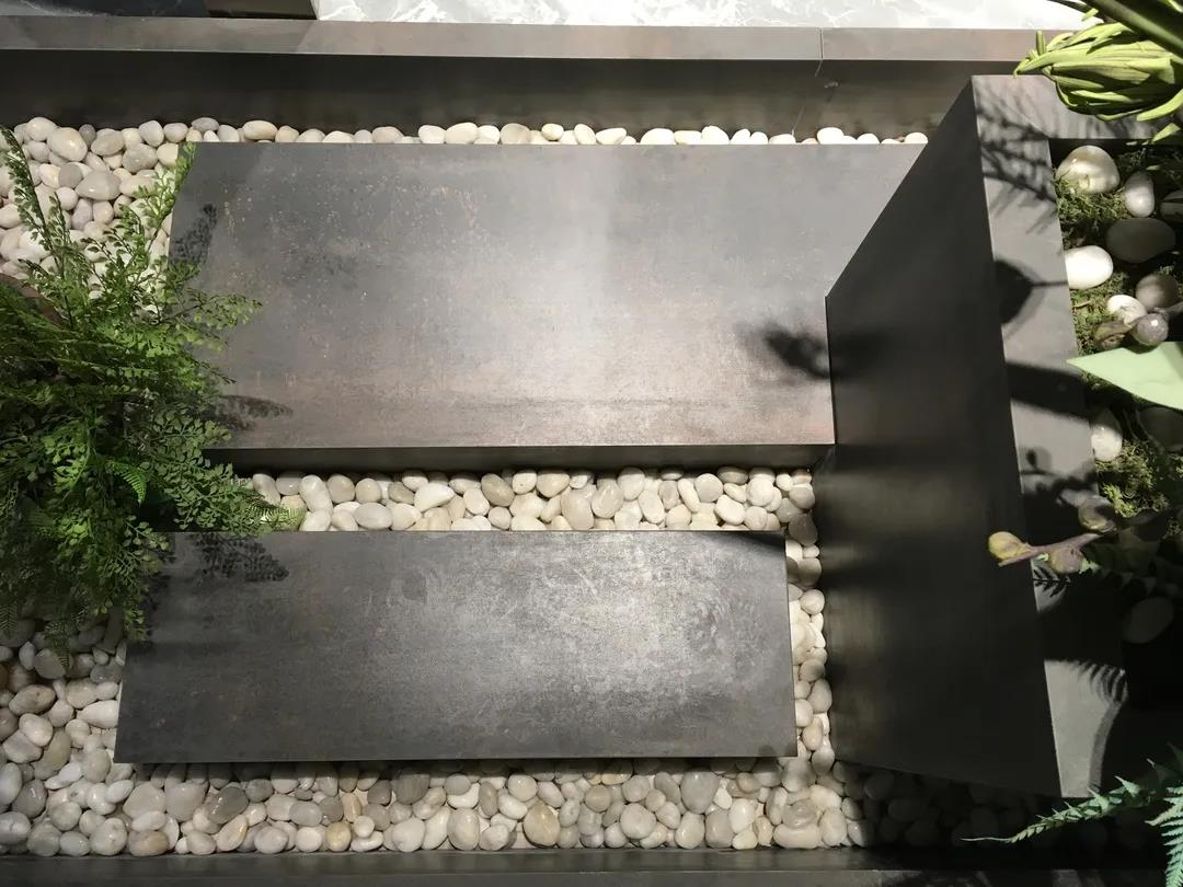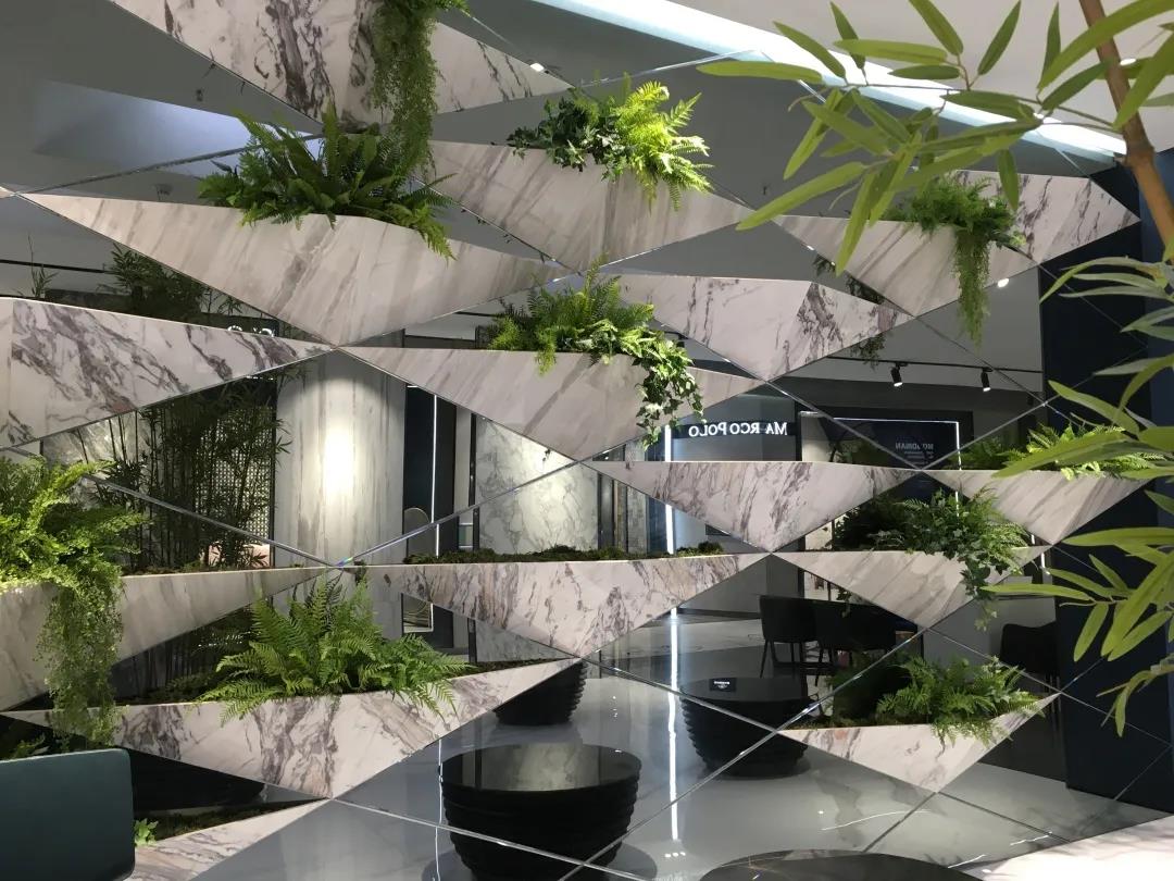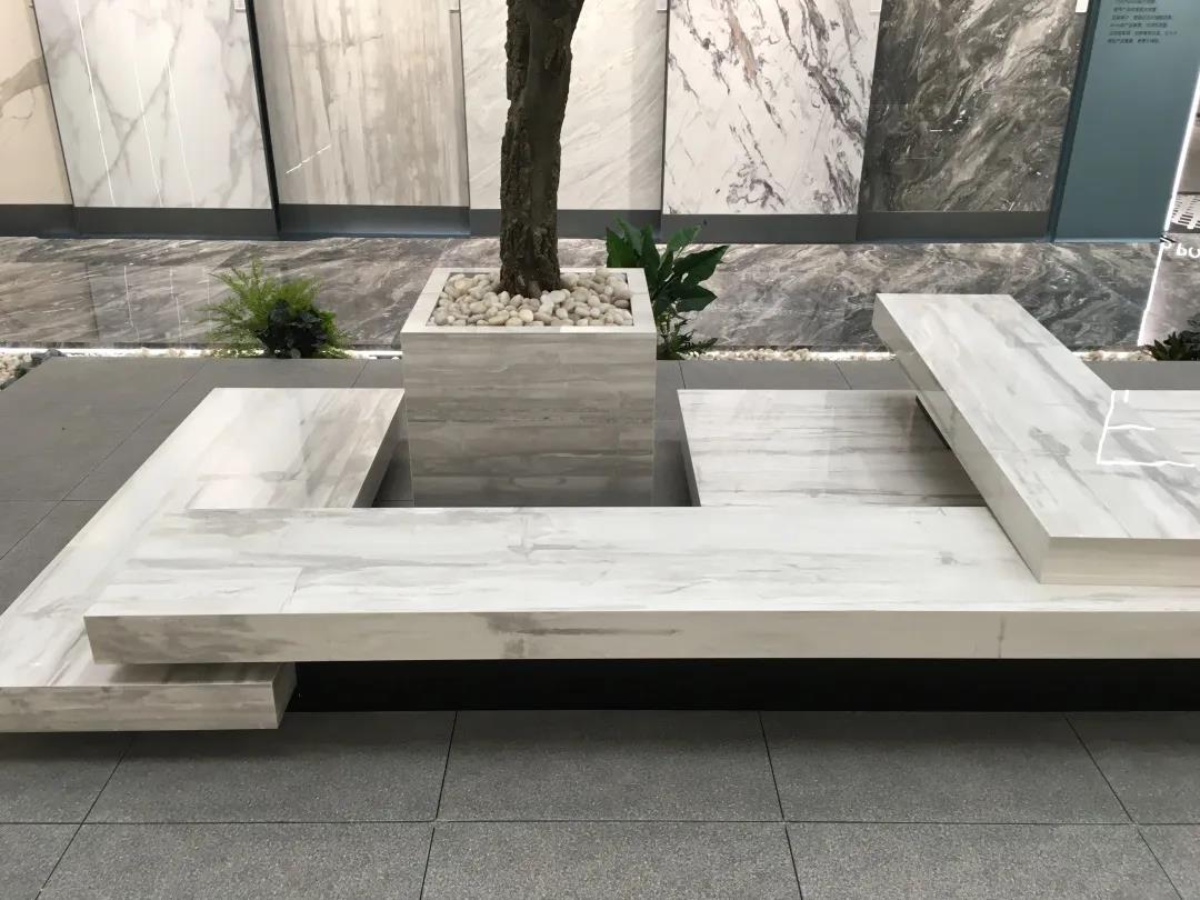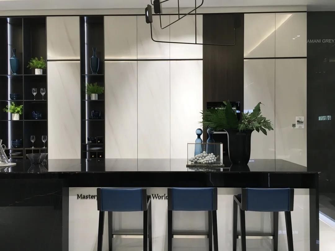 马可波罗岩板系列应用方式从室内地墙面扩展到橱柜、浴室台、桌面等几乎所有家居空间及户外桌椅、树木花盆、建筑外墙等户外领域中,突破瓷砖传统的应用界限。