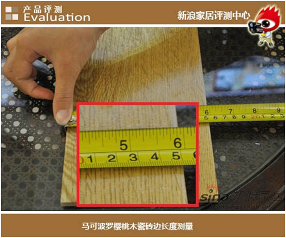 随机取出一块瓷砖,我们先观察它的棱角,从瓷砖的边角切割的地方,平整无裂缝,而且从侧面的曲线看上去也呈笔直状,没有缺掉棱角和歪斜的缺陷。这说明瓷砖饿平直度是过关的。根据瓷砖国家标准,砖的长宽尺寸偏差不得超过±0.5%,通过小编实测,马可波罗樱桃木瓷砖长宽600*150mm,尺寸非常标准。