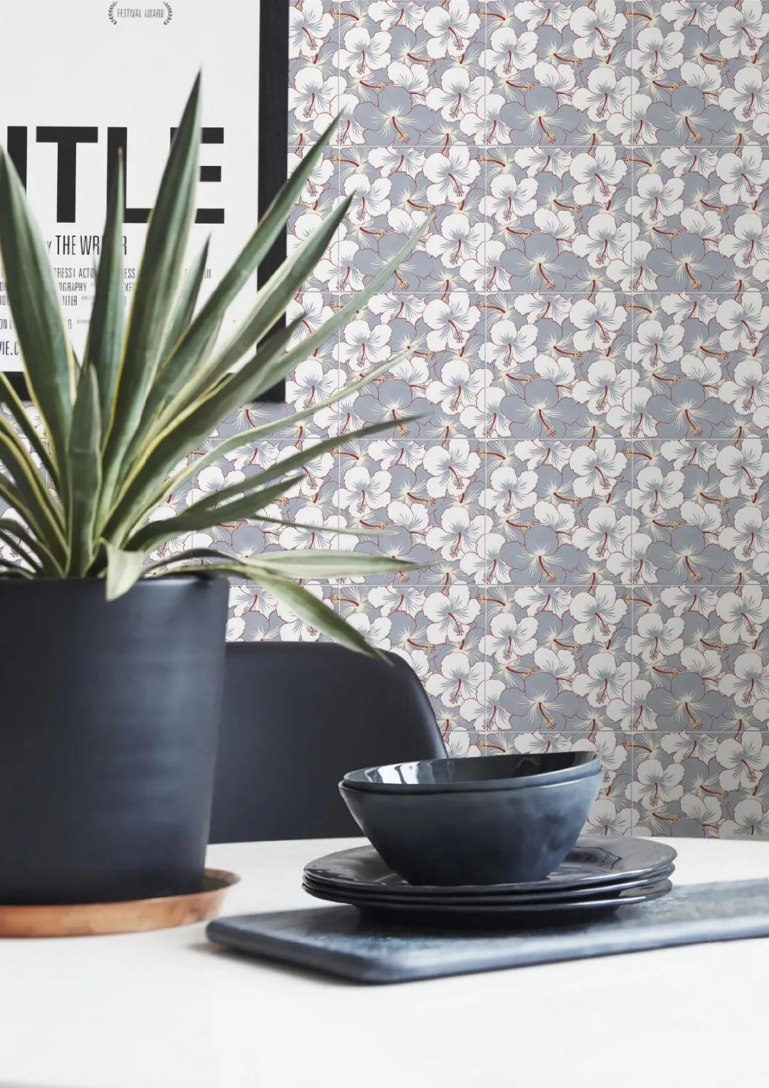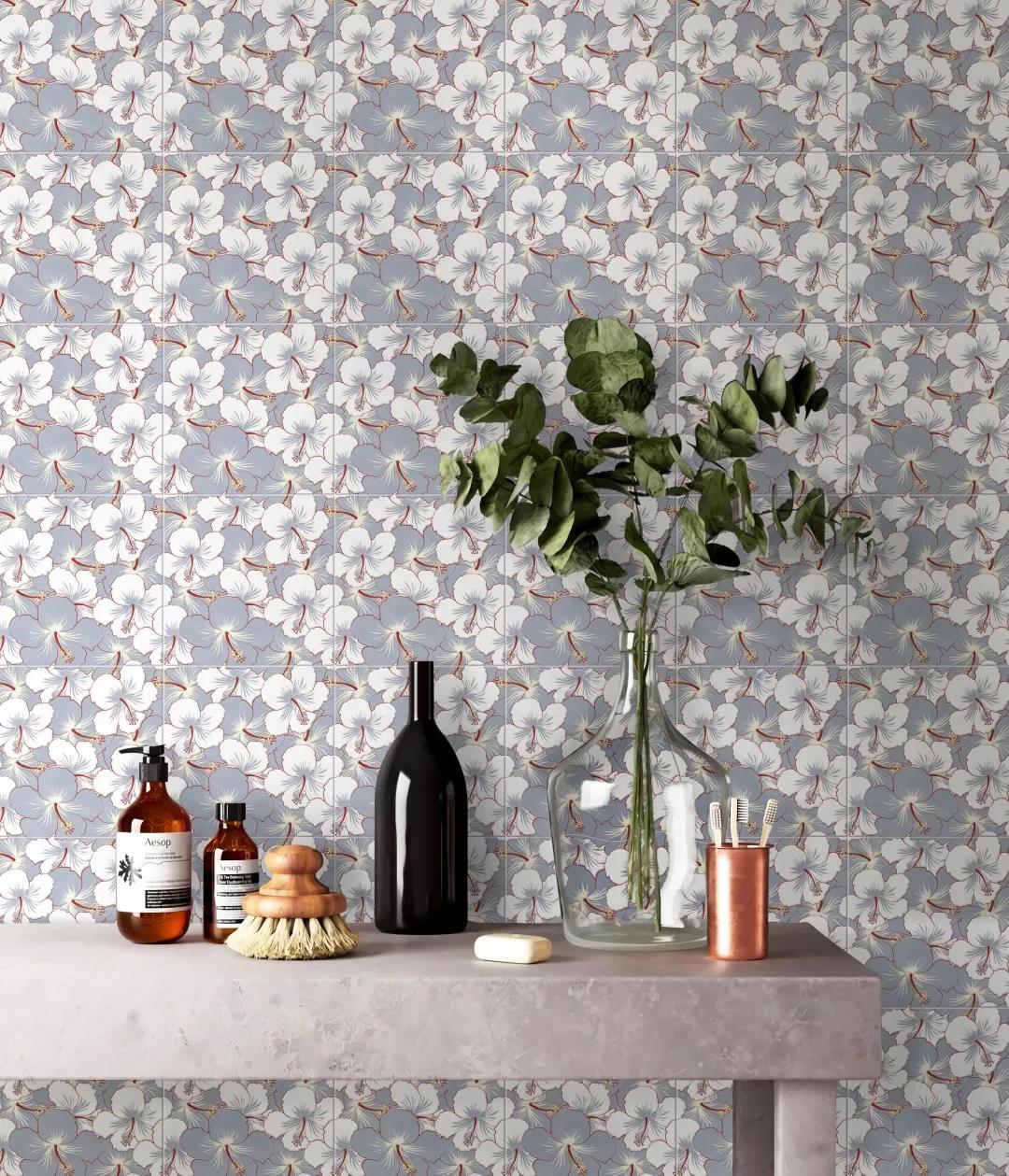 马可波罗瓷砖2021年新品配件木槿芙蓉以芙蓉花为蓝本,加以高级的灰色调、舒适自在的白色调,两色交错叠加,简约而经典。白色花朵柔和,灰色花朵晶莹,保留花蕊中的一抹红加以金线勾勒,是设计的点睛之笔,让配件更显精致和灵动。