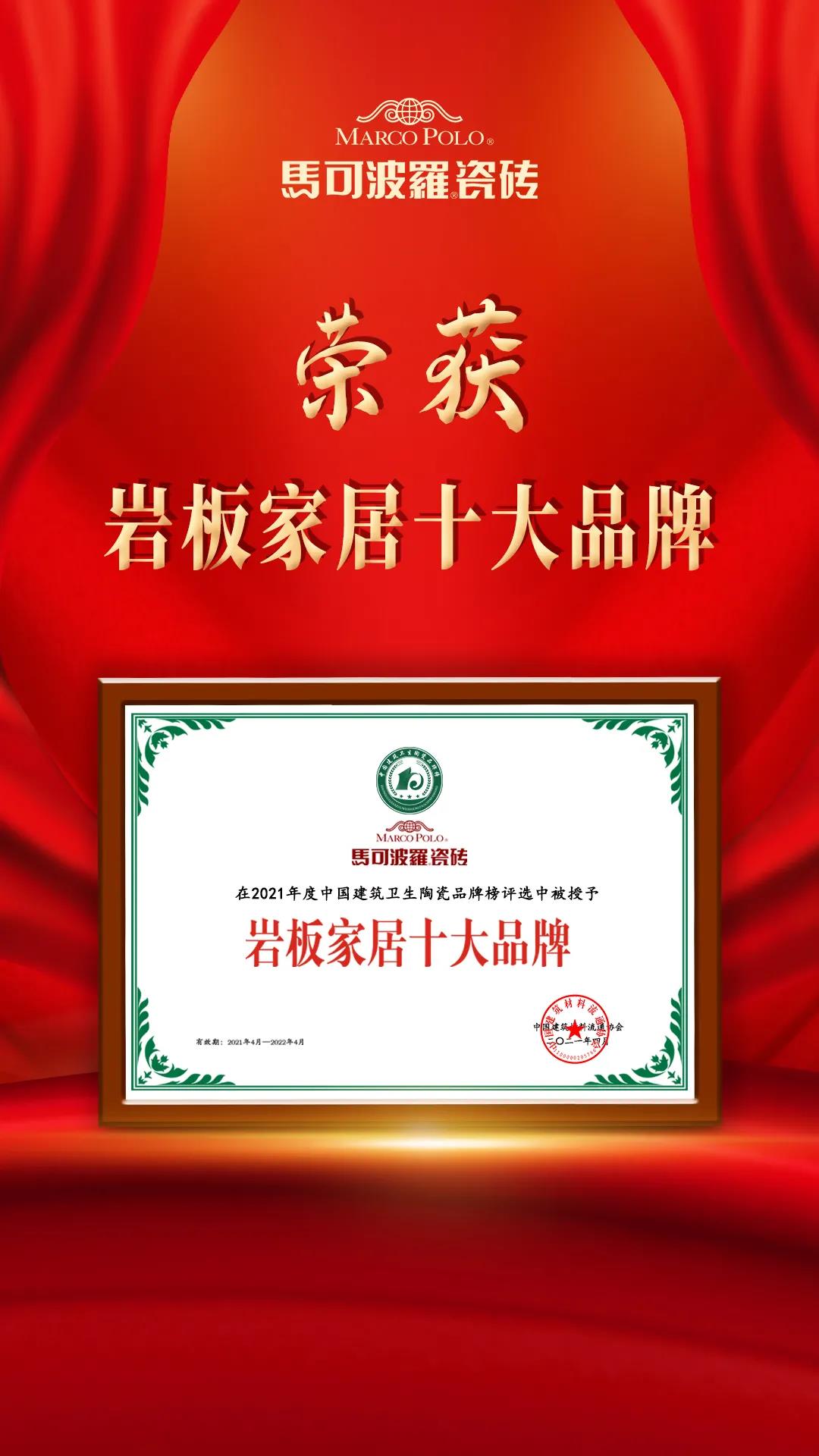 NEWS 喜报 | 马可波罗瓷砖获“岩板家居十大品牌”! 近日,由中国建筑材料流通协会主办,国家市场监管总局督导的“2021年度中国建筑卫生陶瓷品牌榜”发布,马可波罗瓷砖荣获“岩板家居十大品牌”! 发布者:品牌传播与公关部 ×