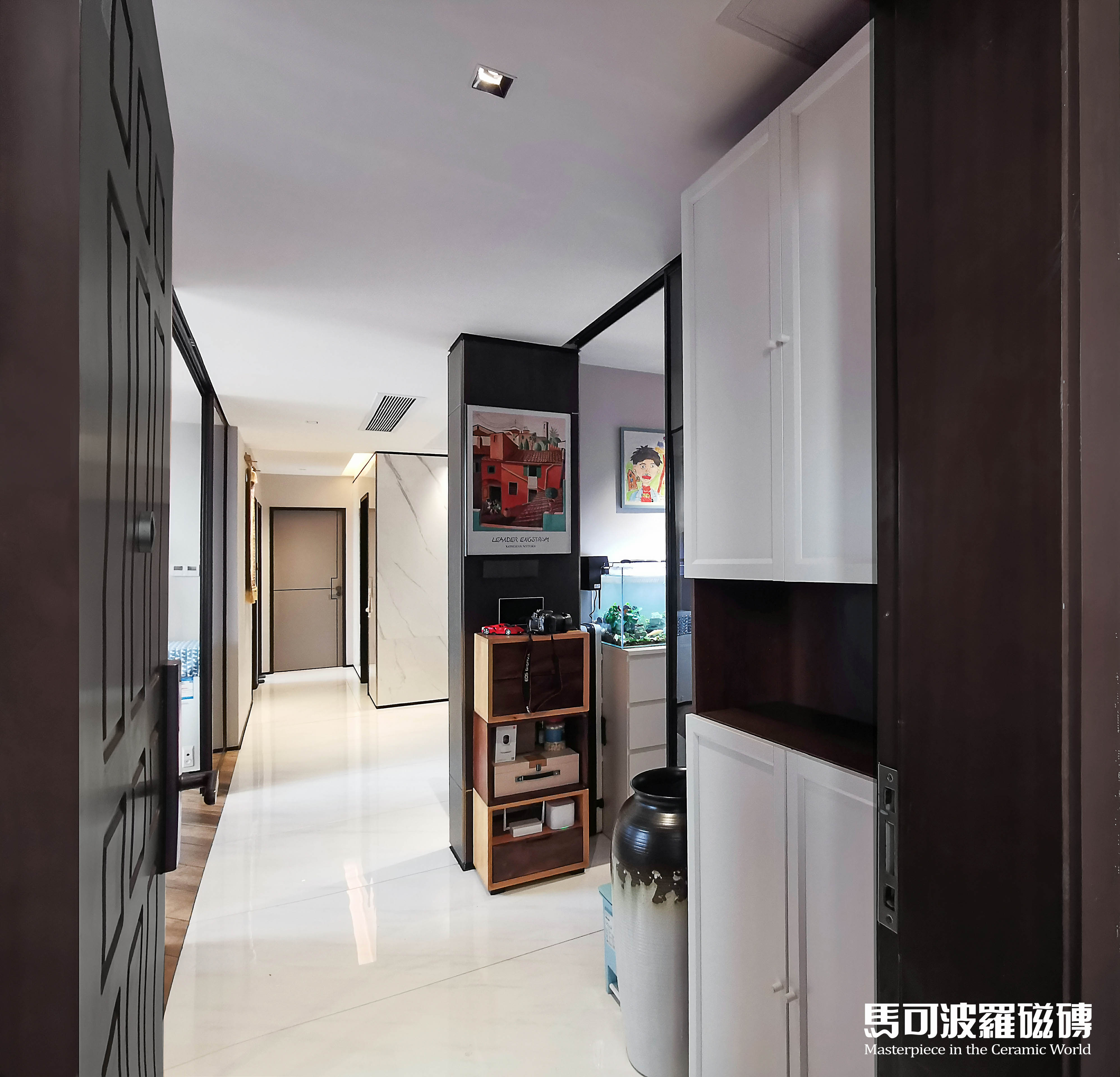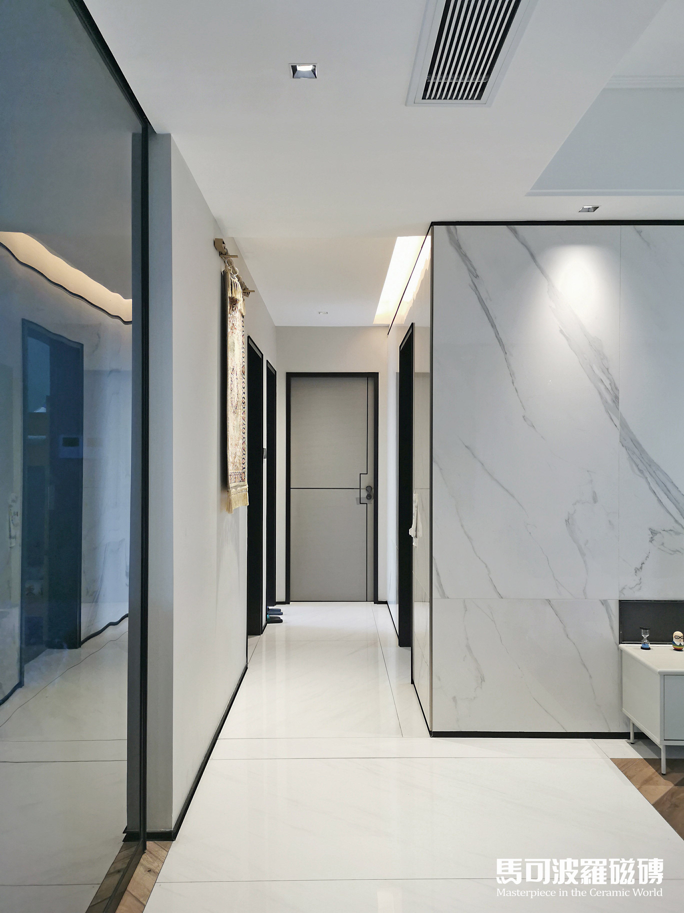 入户是一条长长的通道,地面是干净素雅的大规格白色瓷砖,纹理连续性强,延伸了纵向的视觉效果,整个空间更加修长、大气。而餐厅选用的木纹砖,则很好地将餐厨与公共区域分隔开。