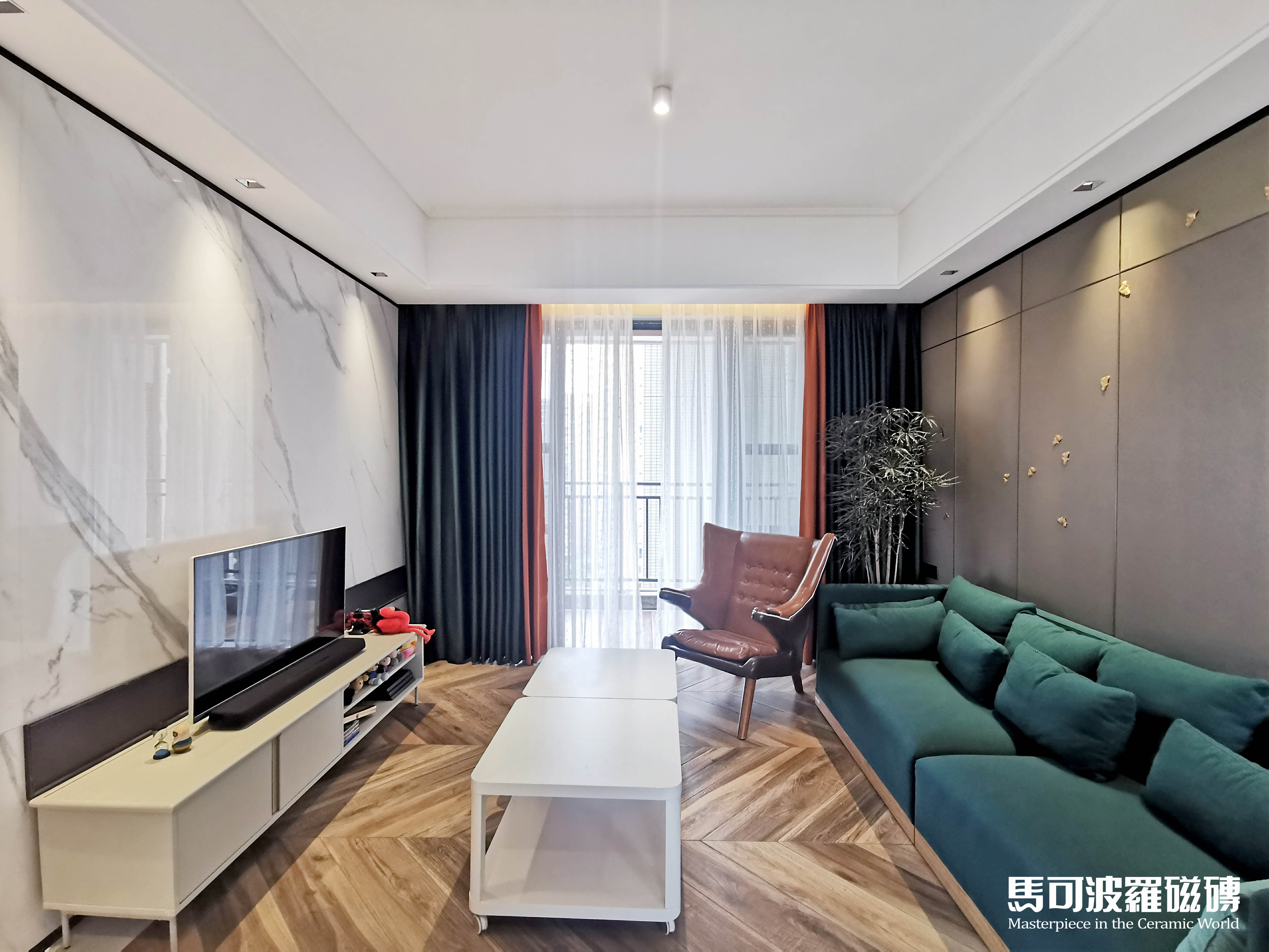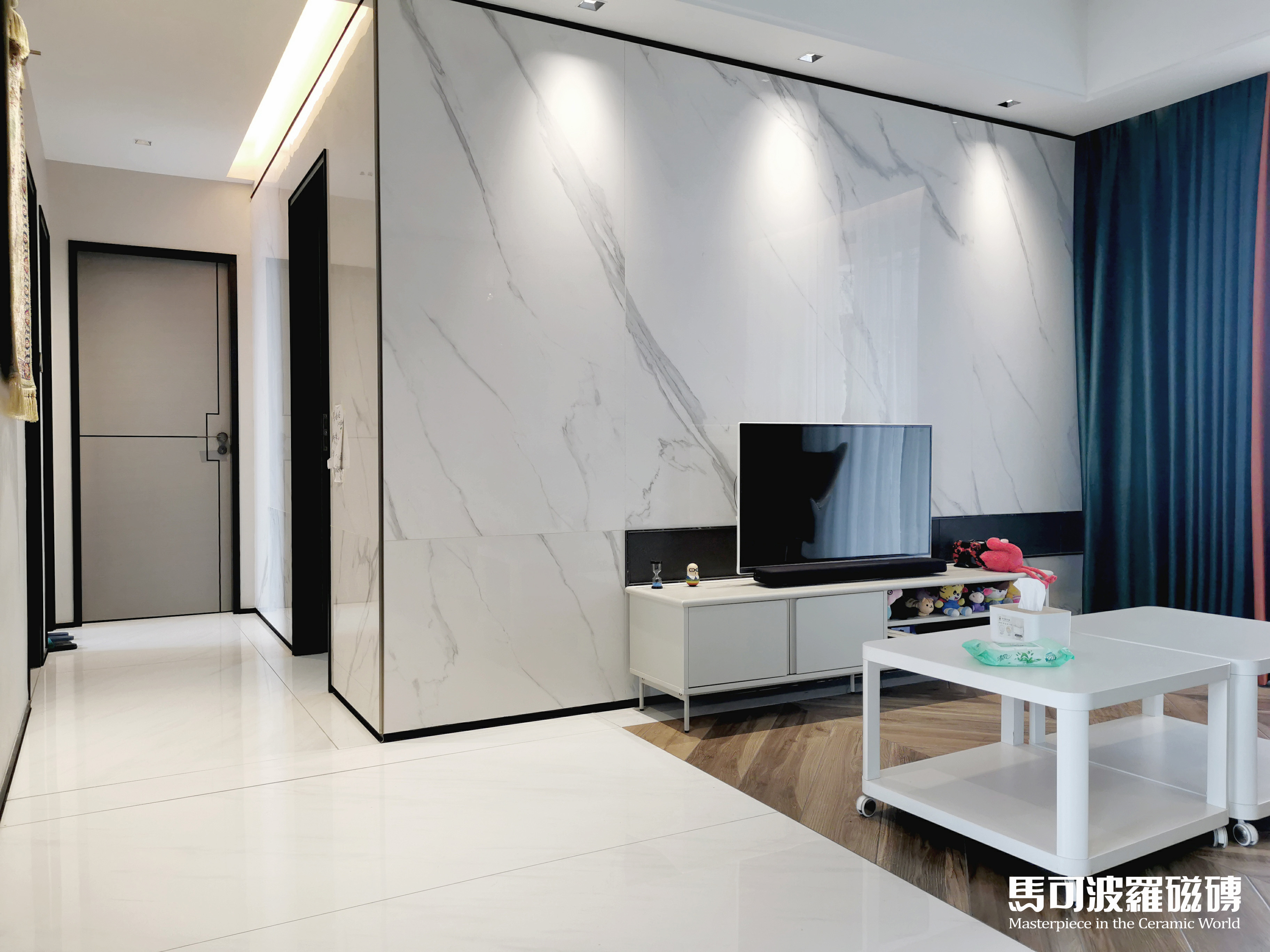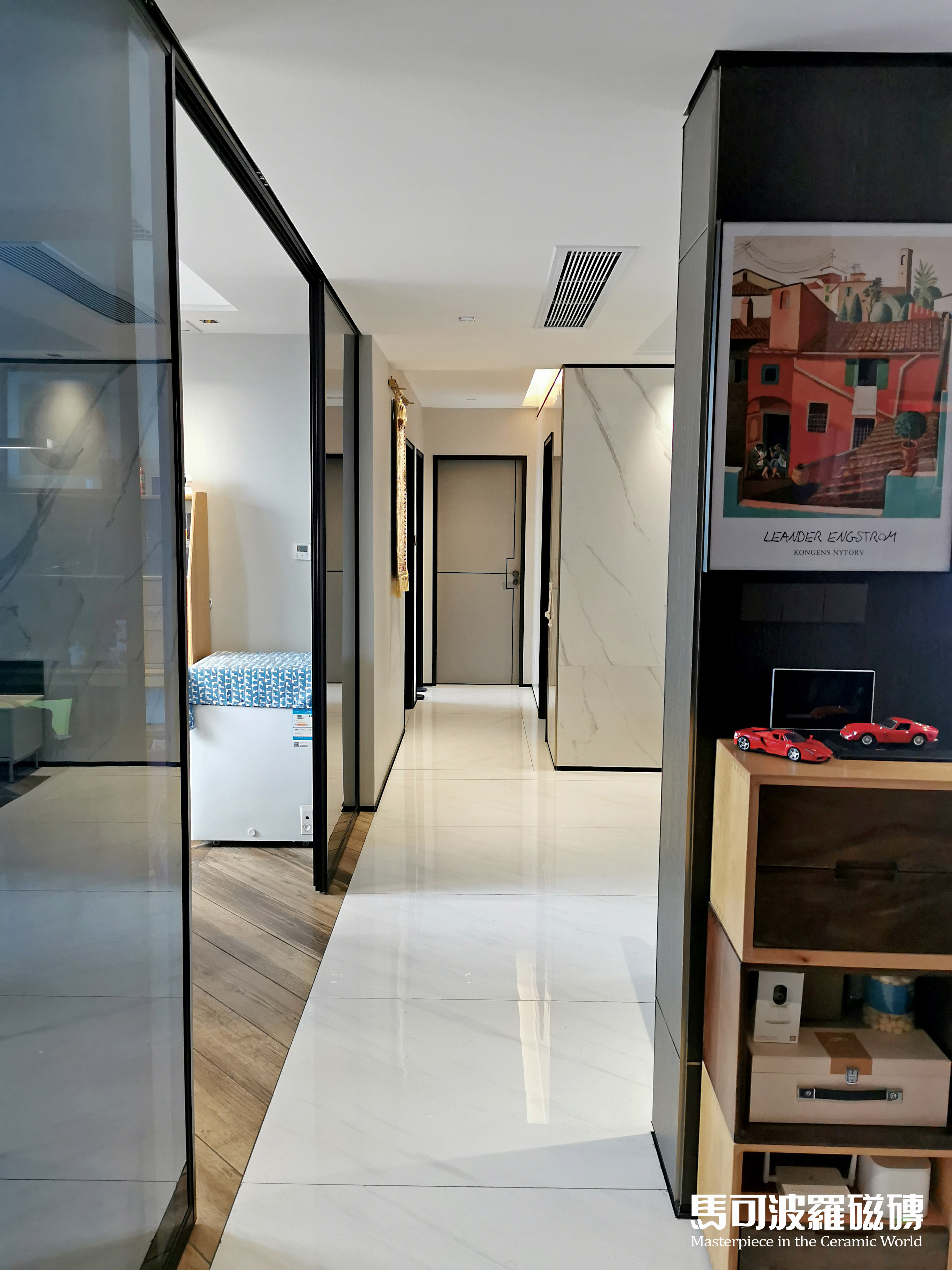 客厅电视背景墙是当下流行的大规格岩板,纹理精致细腻。延伸至过道地面、墙面都是同等规格花色的岩板,墙地花色统一,使得空间整体性增强。