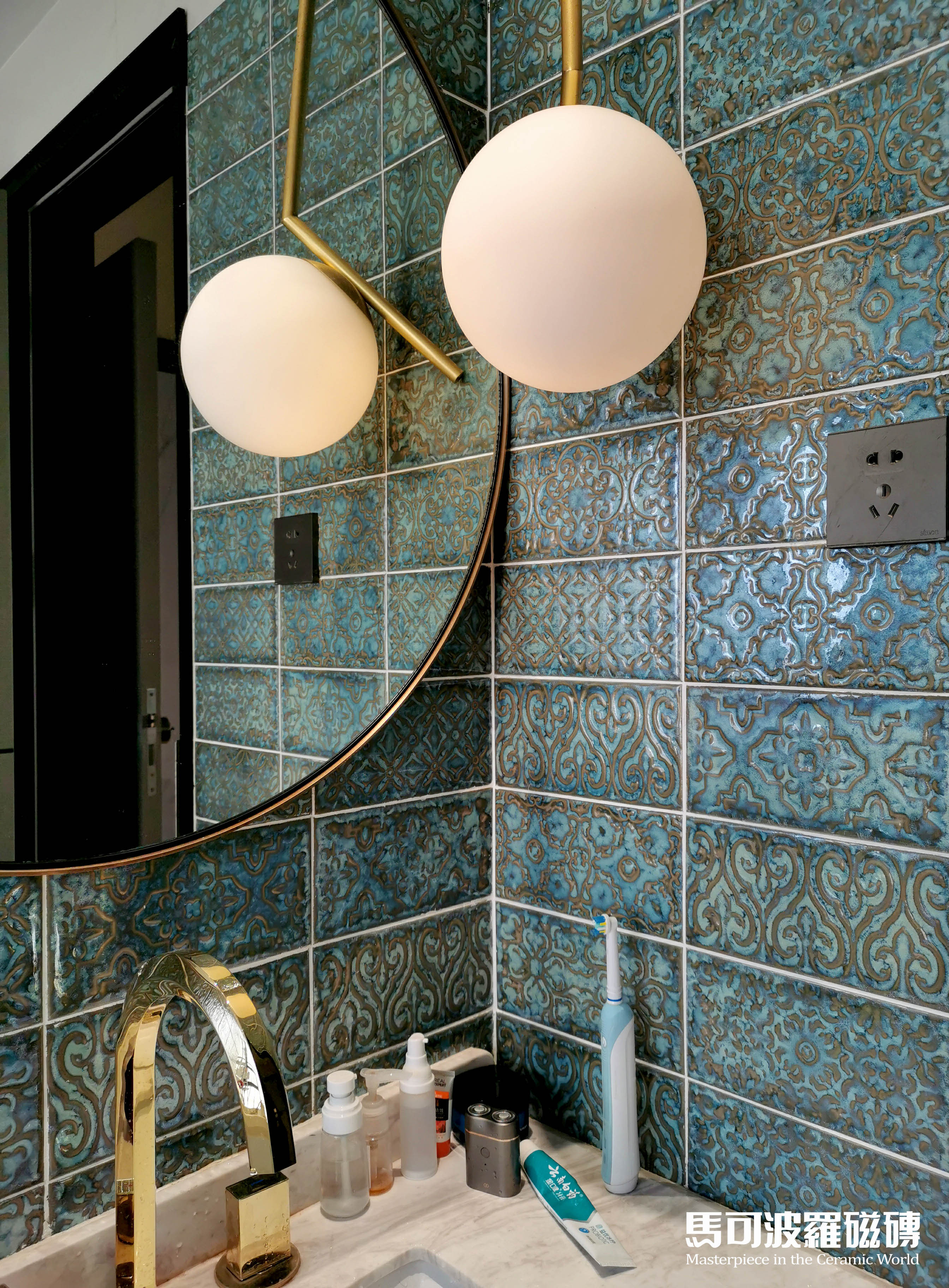 洗漱区墙面铺贴的是小块花砖,古典的灰绿色搭配金属灯条和黄铜色圆镜,绿、白、金大胆撞色,设计感跃然而出。