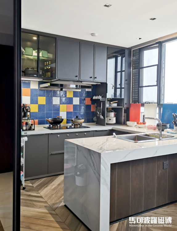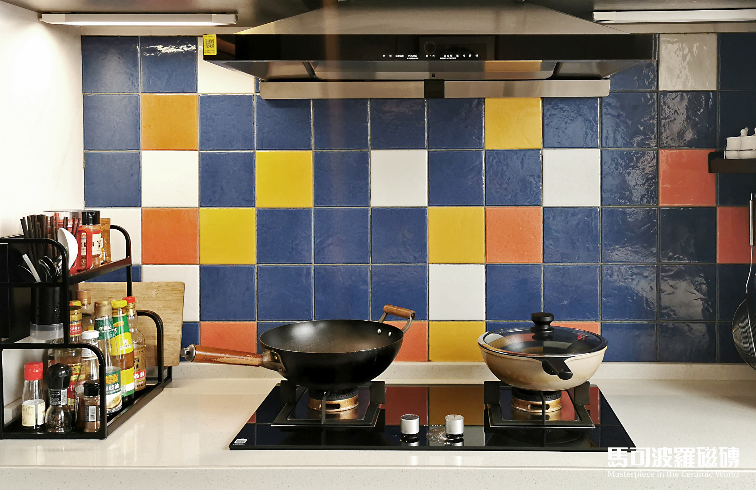 墙面选用撞色花砖,成为厨房一抹靓丽的风景线,复古又吸睛。很多人认为小规格瓷砖由于缝隙多,很容易藏污纳垢,但其实只要在铺贴时采用优质的填缝材料,后续的清洁就完全不用担心。