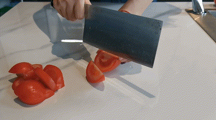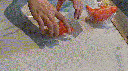 中岛台台面选用的是当下流行的新型材料马可波罗岩板,材质安全,可以直接和食物接触,在上面切水果、切菜。与坚韧菜刀多次触碰,马可波罗岩板台面依旧毫发无损,非常耐磨耐刮。