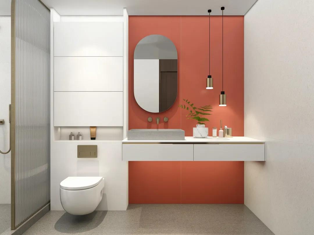 饱和度相对较高的桑染红,色彩雍容秀丽,自带“女王范”气场。搭配浅色的墙砖和白色柜体,展现着恰到好处的精致与清新。