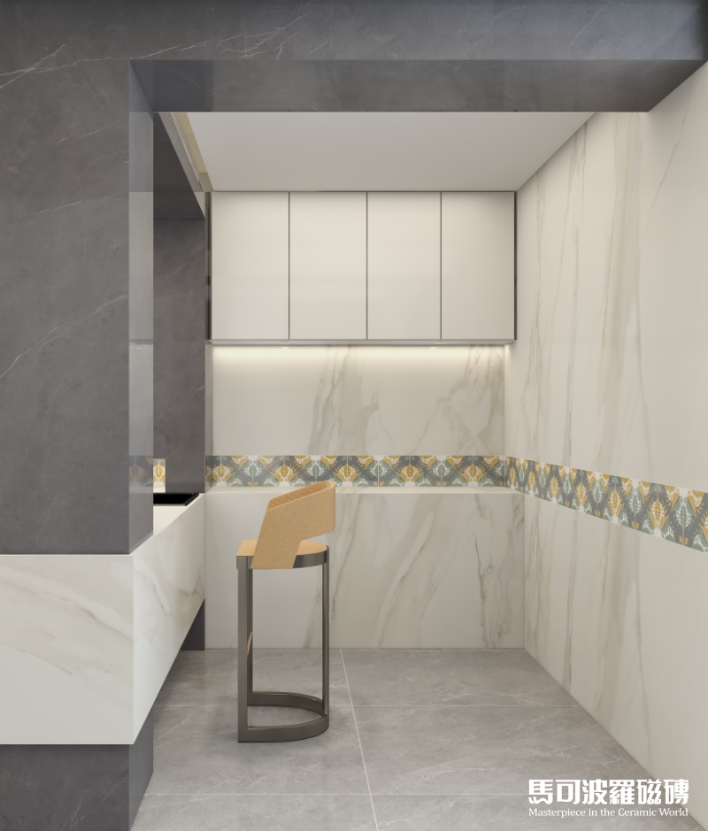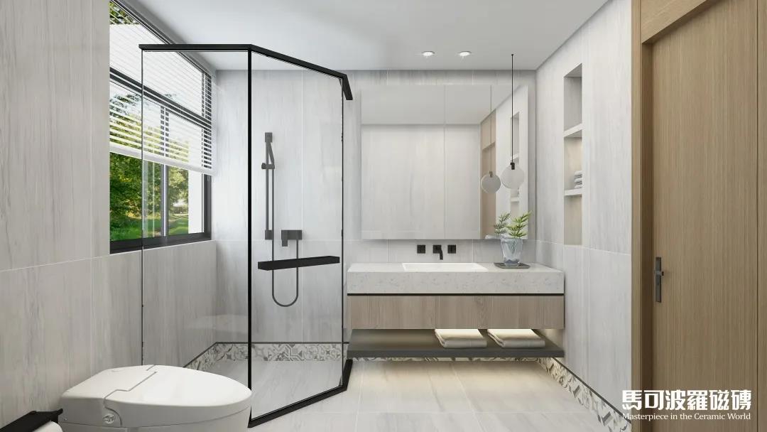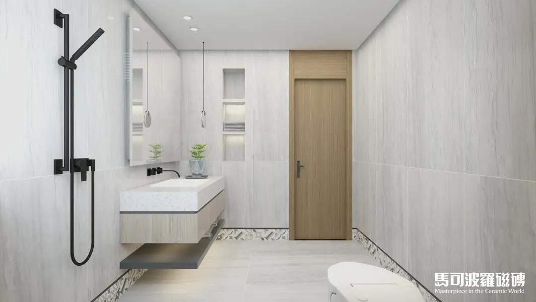 以浅灰色为主基调,墙地面采用马可波罗瓷砖安达鲁,白色竖纹时尚清新,配上花片脚线点缀,为简约空间塑造了独特的几何美感,享受每一天赏心悦目的淡雅时光。