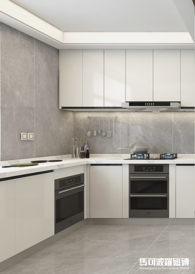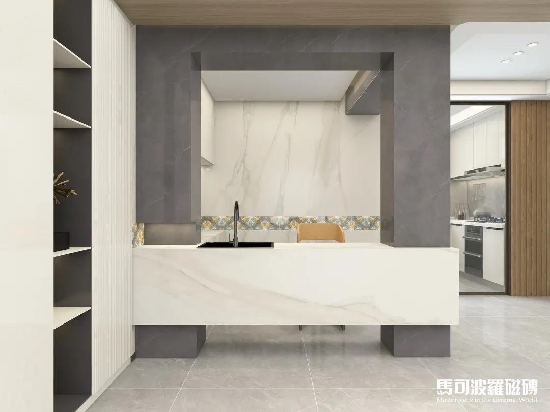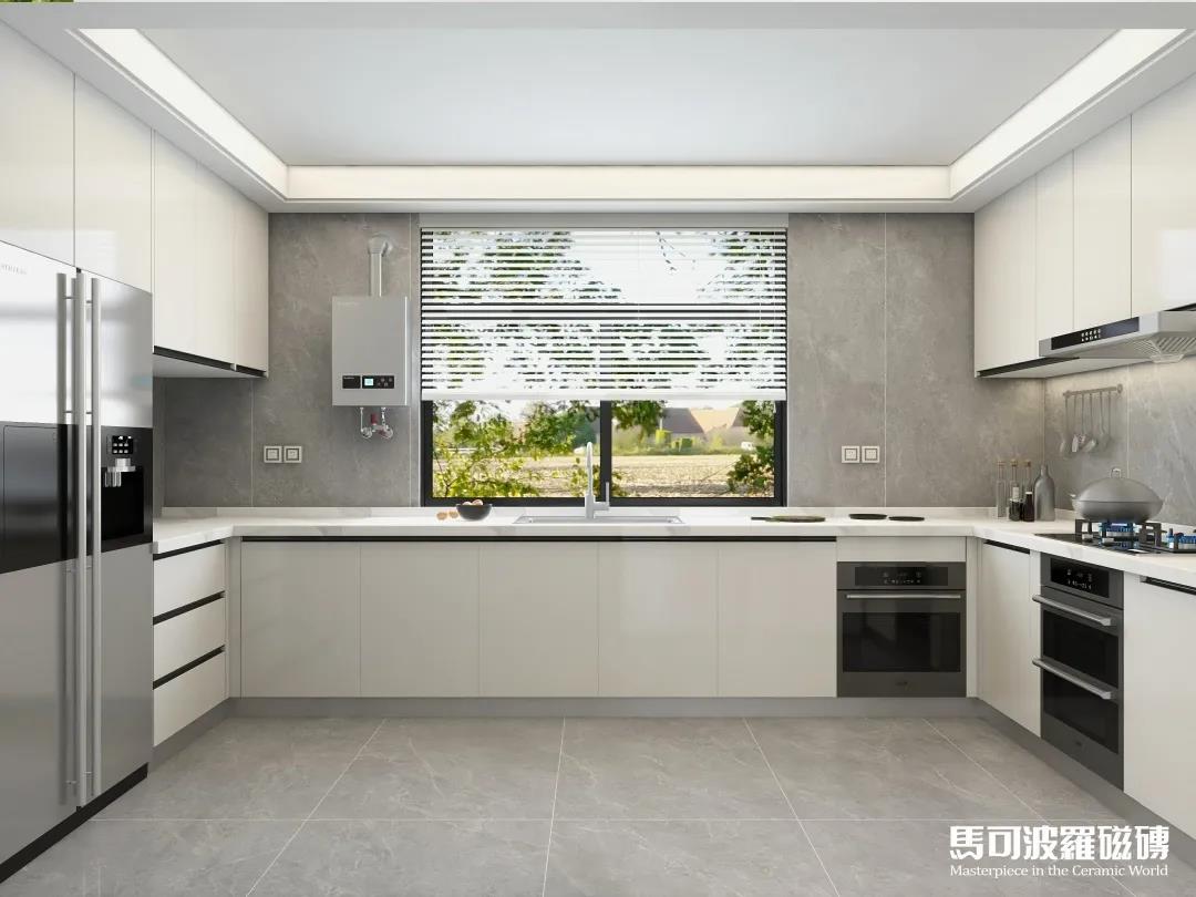 厨房墙地面使用马可波罗瓷砖布鲁斯灰,搭配简约造型的台面与橱柜,优雅的灰白配色满满现代感,也让厨房空间更显精致清新。