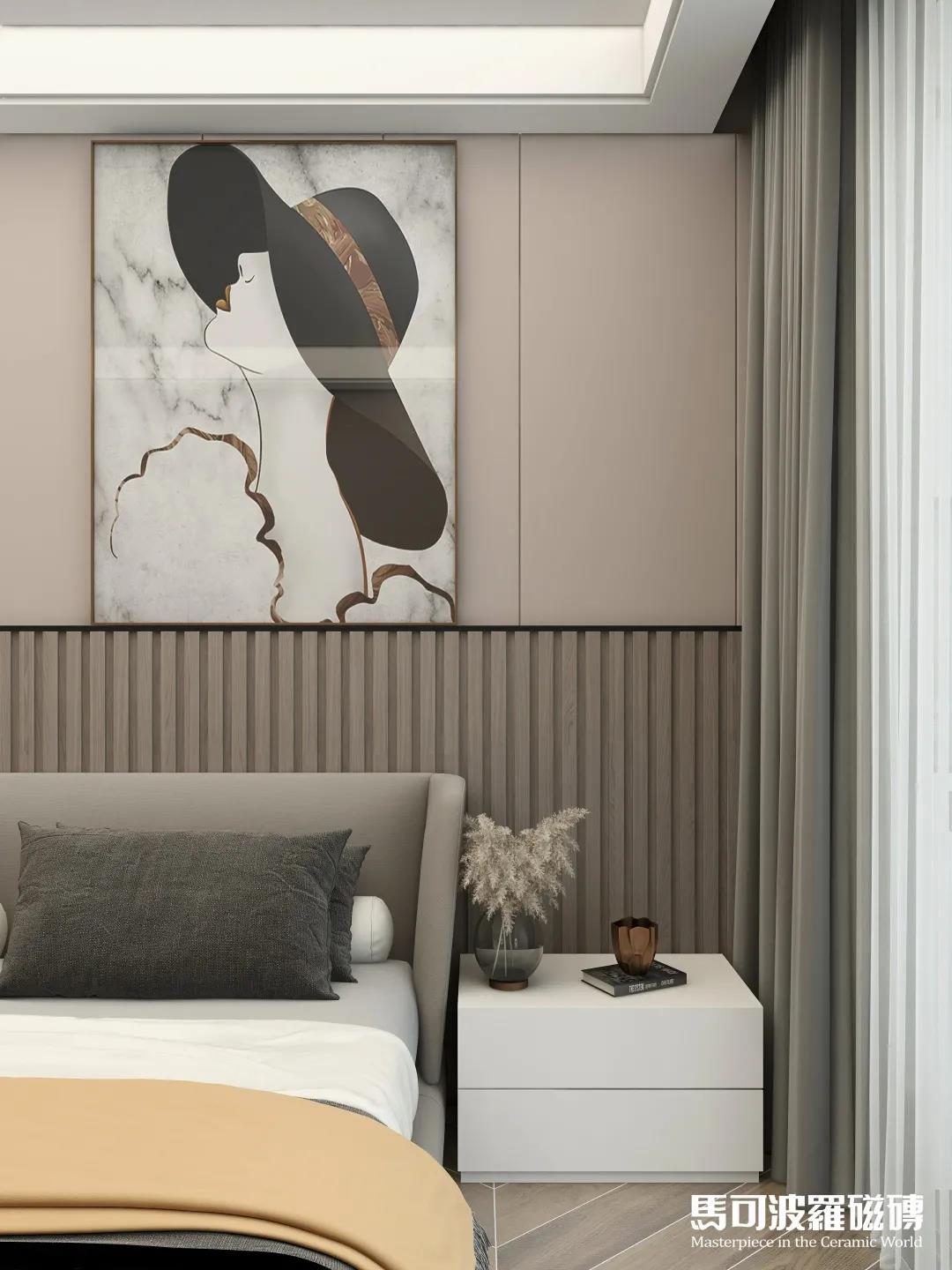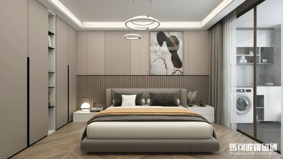 地面鱼骨铺贴维卡木纹砖,墙面干净纯粹的浅灰色,让卧室空间显现出独特的自然温馨气息。低饱和度色彩、不同明度的灰色和棕木色巧妙搭配结合,让每一处角落都洋溢着温暖舒适的生活情调。