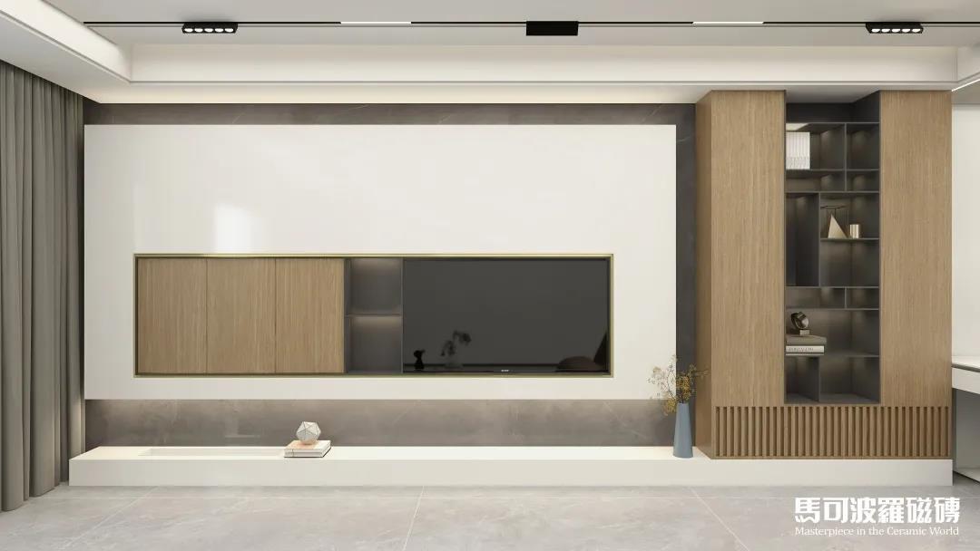 电视背景墙使用马可波罗岩板北极银灰石,深灰色细腻交错的纹理与亮白色的电视柜形成明暗对比,搭配上原木柜架的舒缓纹路,让静谧的空间更添几分素雅与温润。
