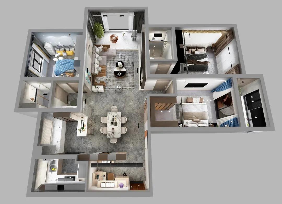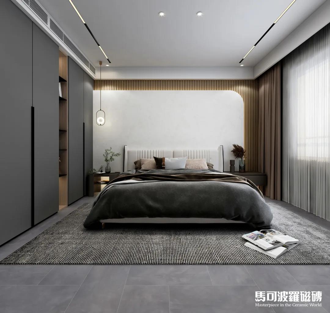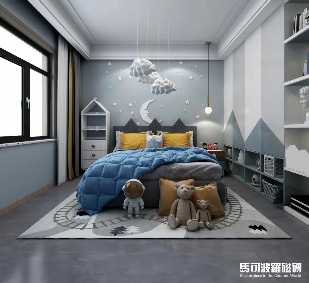 主卧、次卧、儿童房地面整体采用马可波罗瓷砖莫兰迪,深蓝色砖面呈现异形切割铺贴,为休息和睡眠的空间增添了无限舒适美好想象。