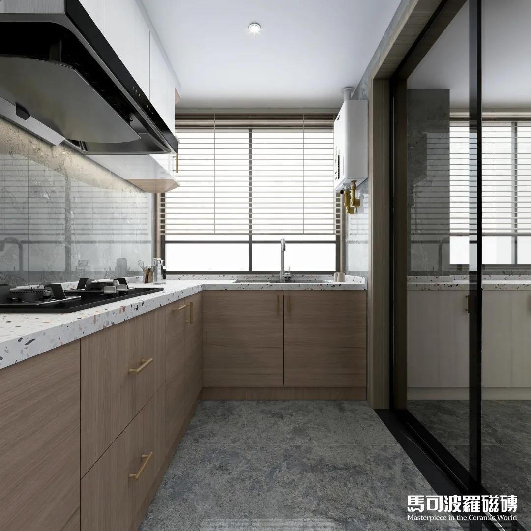 厨房墙面采用马可波罗大板巴黎石,整体设计简单明了,原木色的橱柜,为空间增添了一抹雅致与温馨。