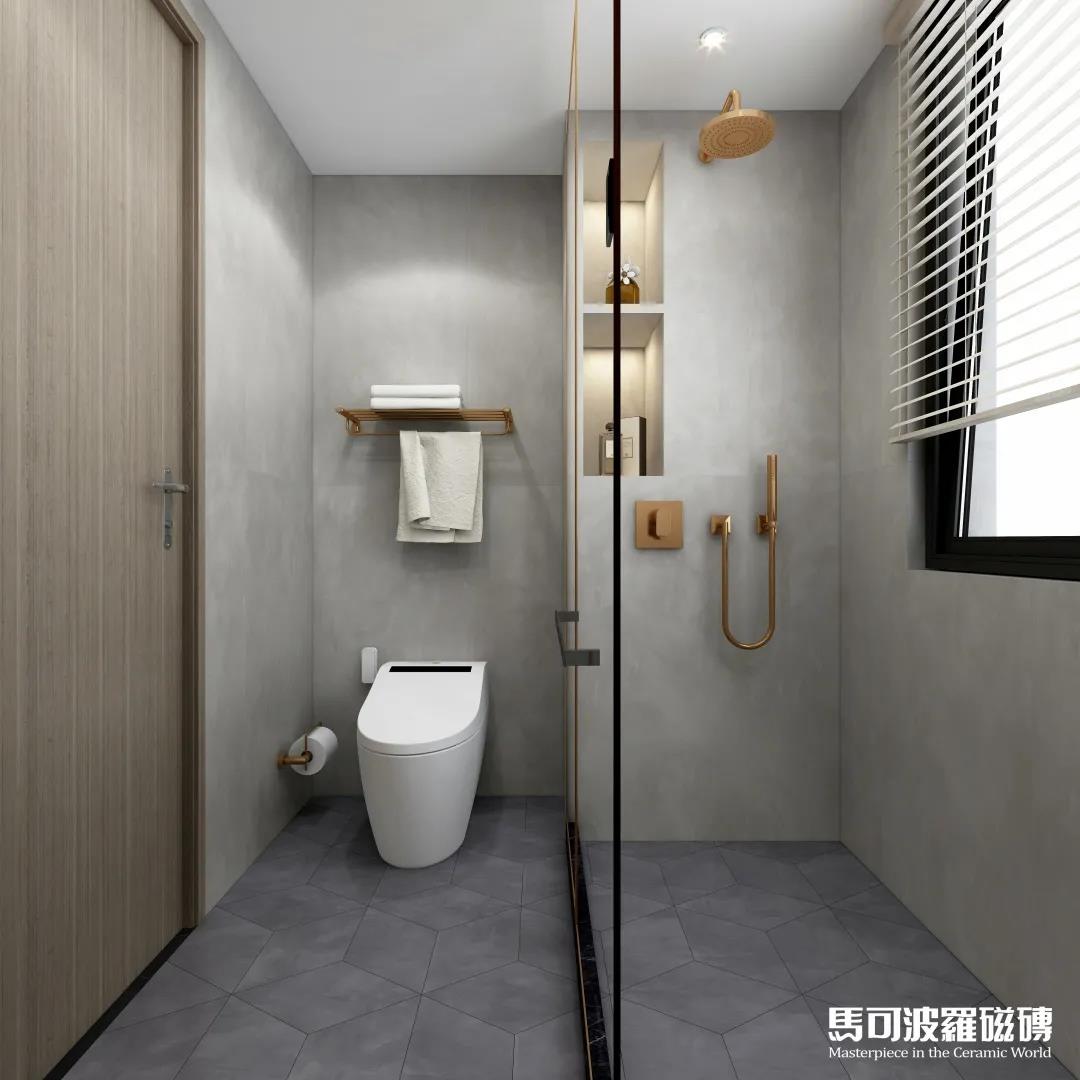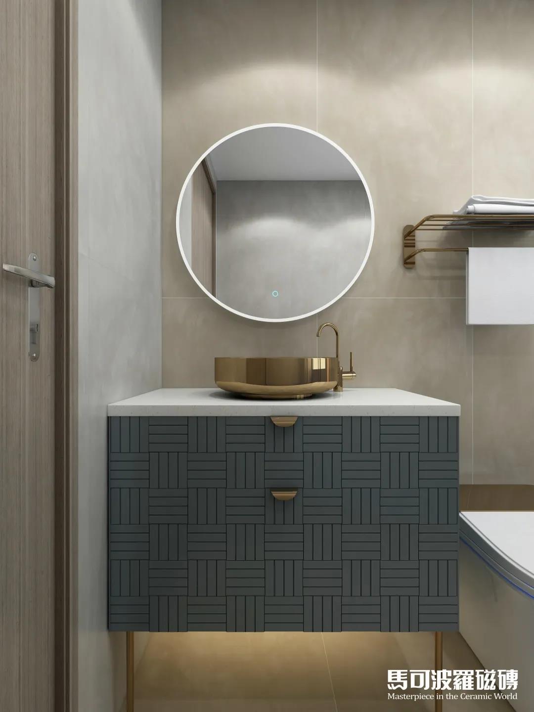 主卫墙地面选用两种不同颜色的莫兰迪,搭配黄铜色台盆、移门、花洒等点缀,简约设计中又隐约可见古典美学的色彩风范,气质优雅盎然。