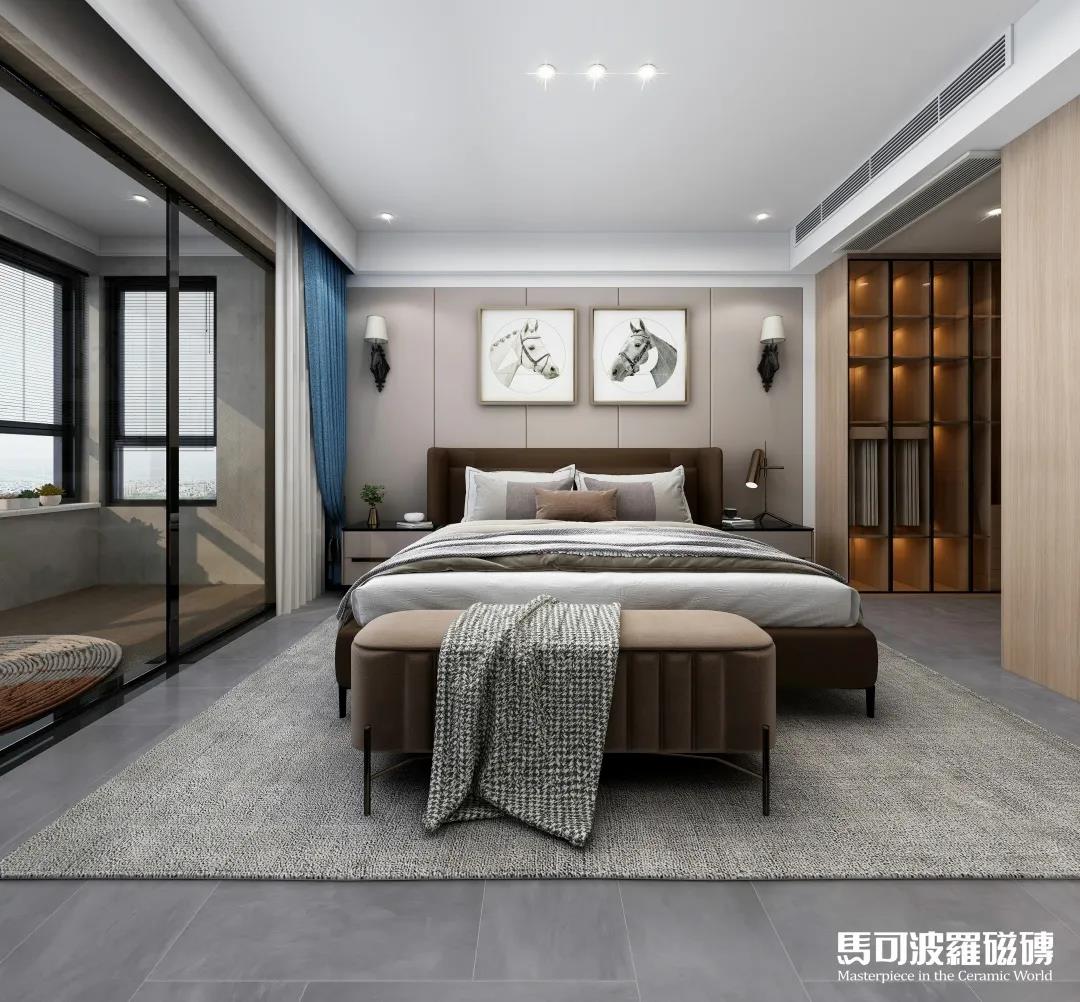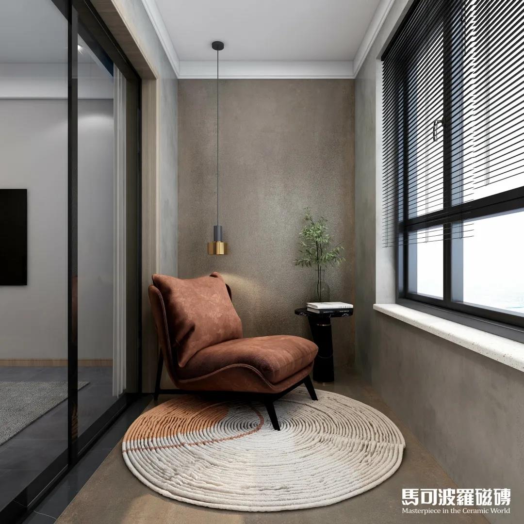 次卧采用温馨暖意的原木风格设计,阳台铺贴则使用马可波罗岩板毕尔巴鄂,暖色射灯的照射下,岩板表面细腻的光泽与质感,让空间格外温暖和舒适。
