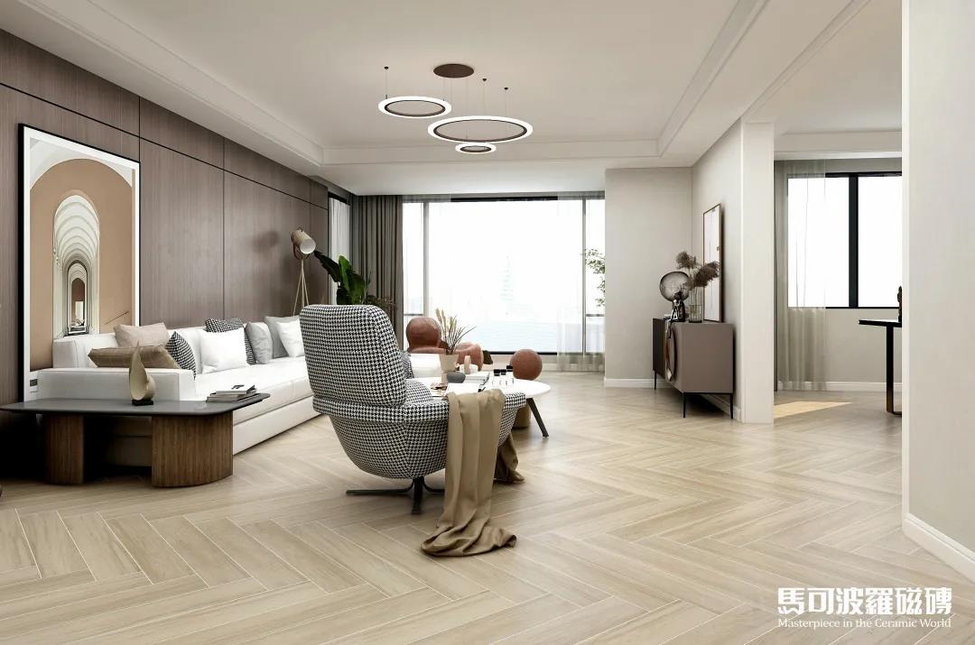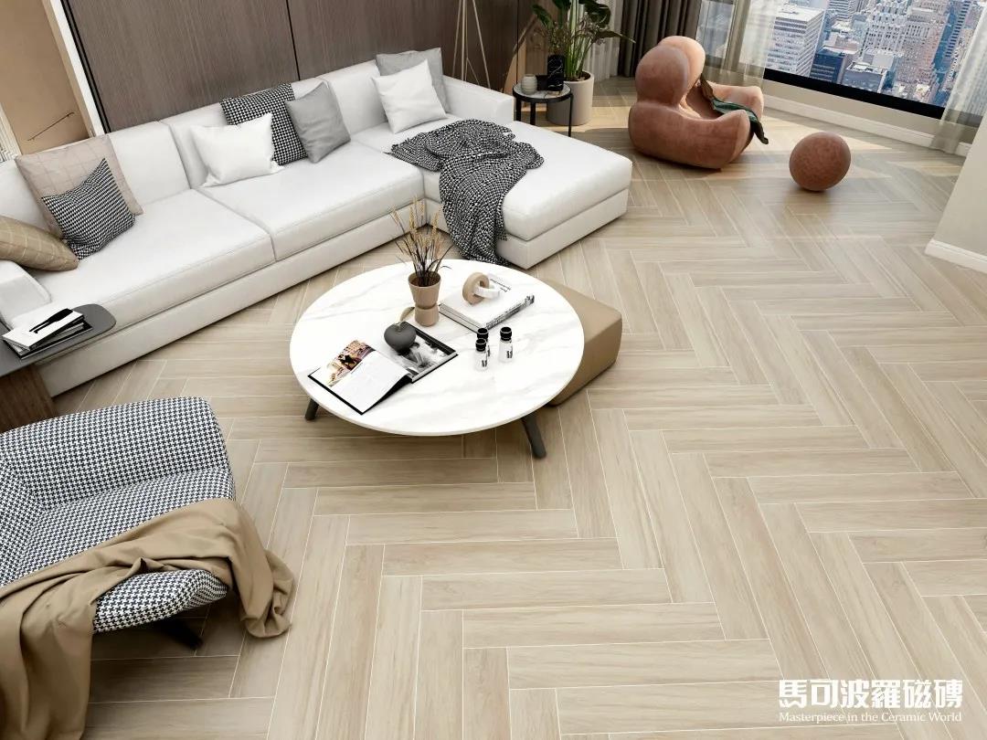 地面的浅杏色木纹砖赛州檀木采用人字形铺贴式,时尚兼具层次感,搭配简约规整的浅色家居布置,阳光透过落地窗照射进来,一派清新怡然。