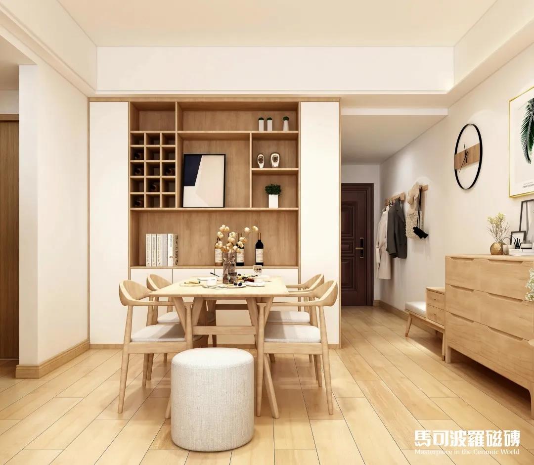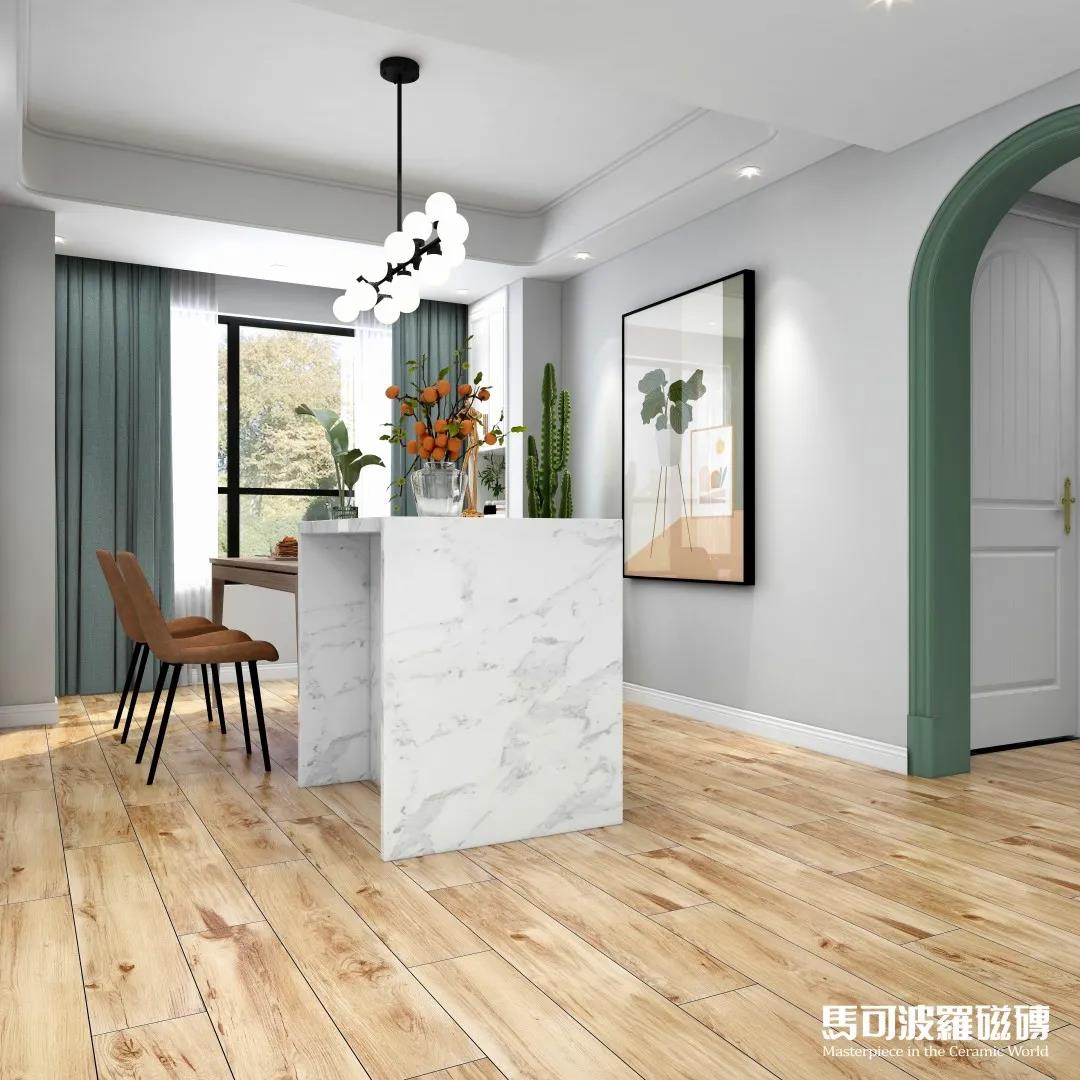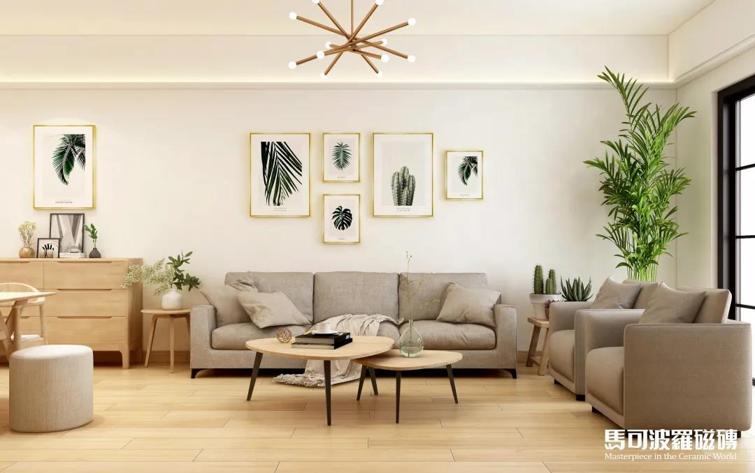 马可波罗木纹砖芬兰赤松,独具北欧风情的柔和色调,搭配木色与浅灰色家装,加之绿植和挂画点缀,清新又不失精致品味。