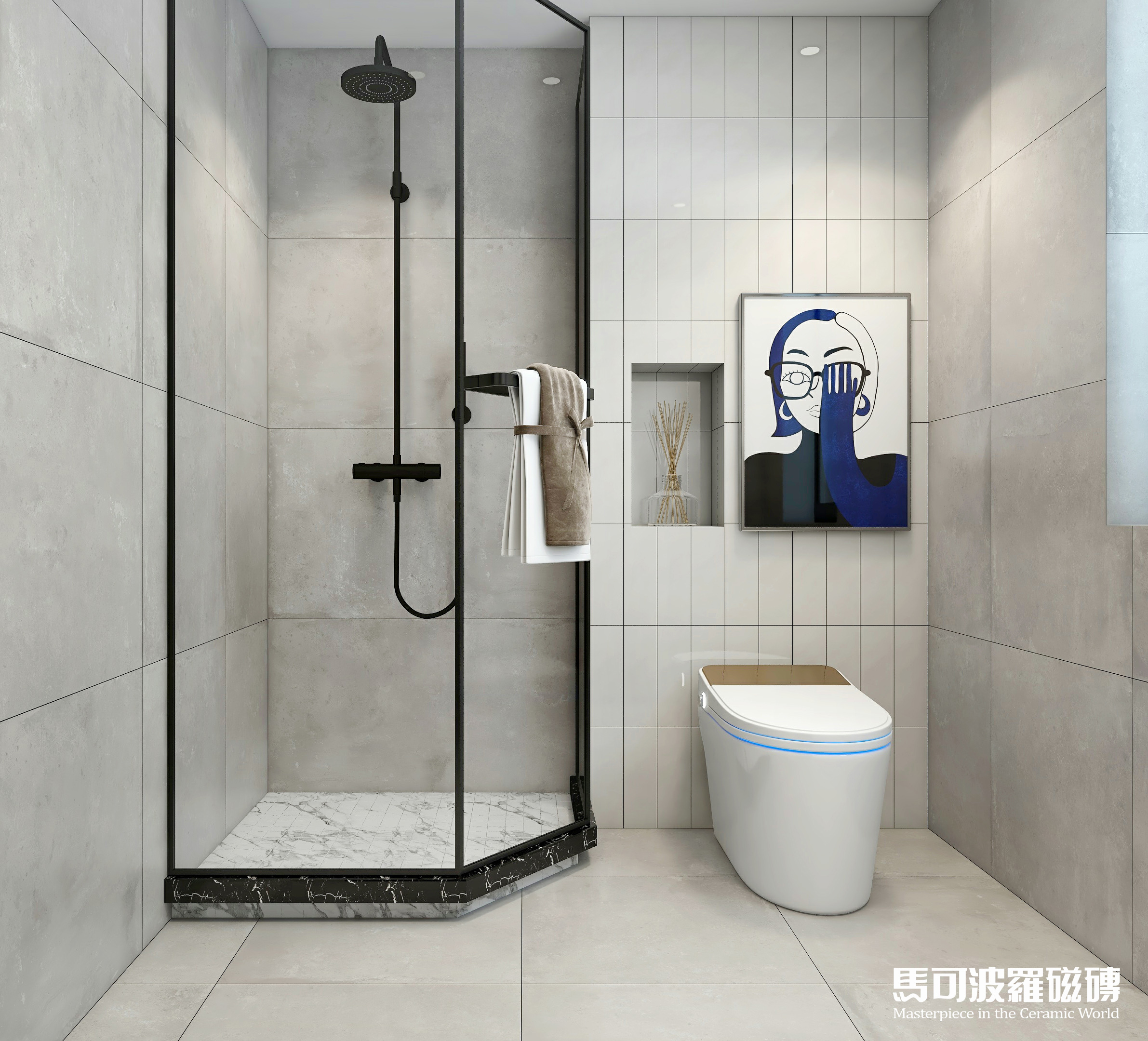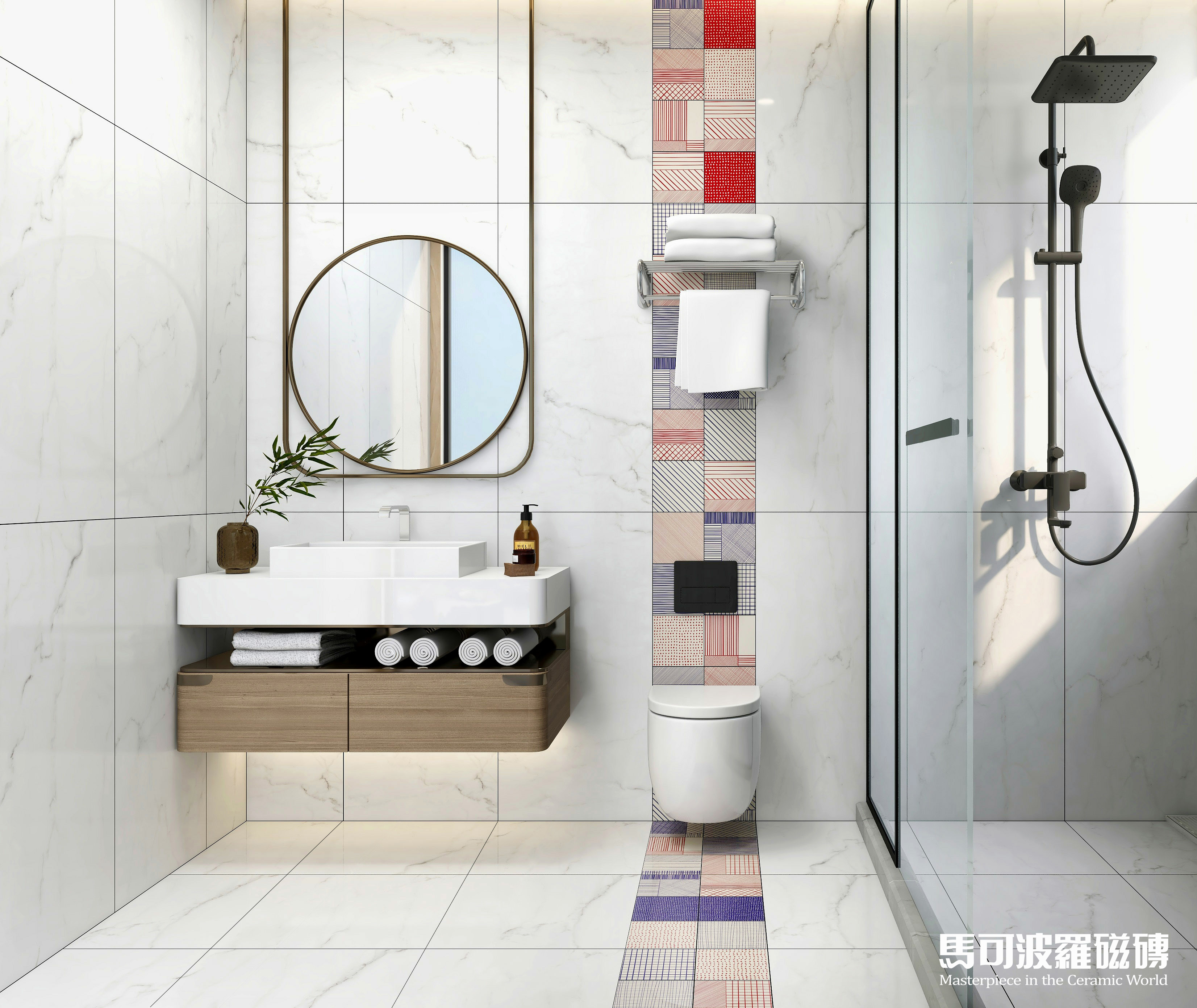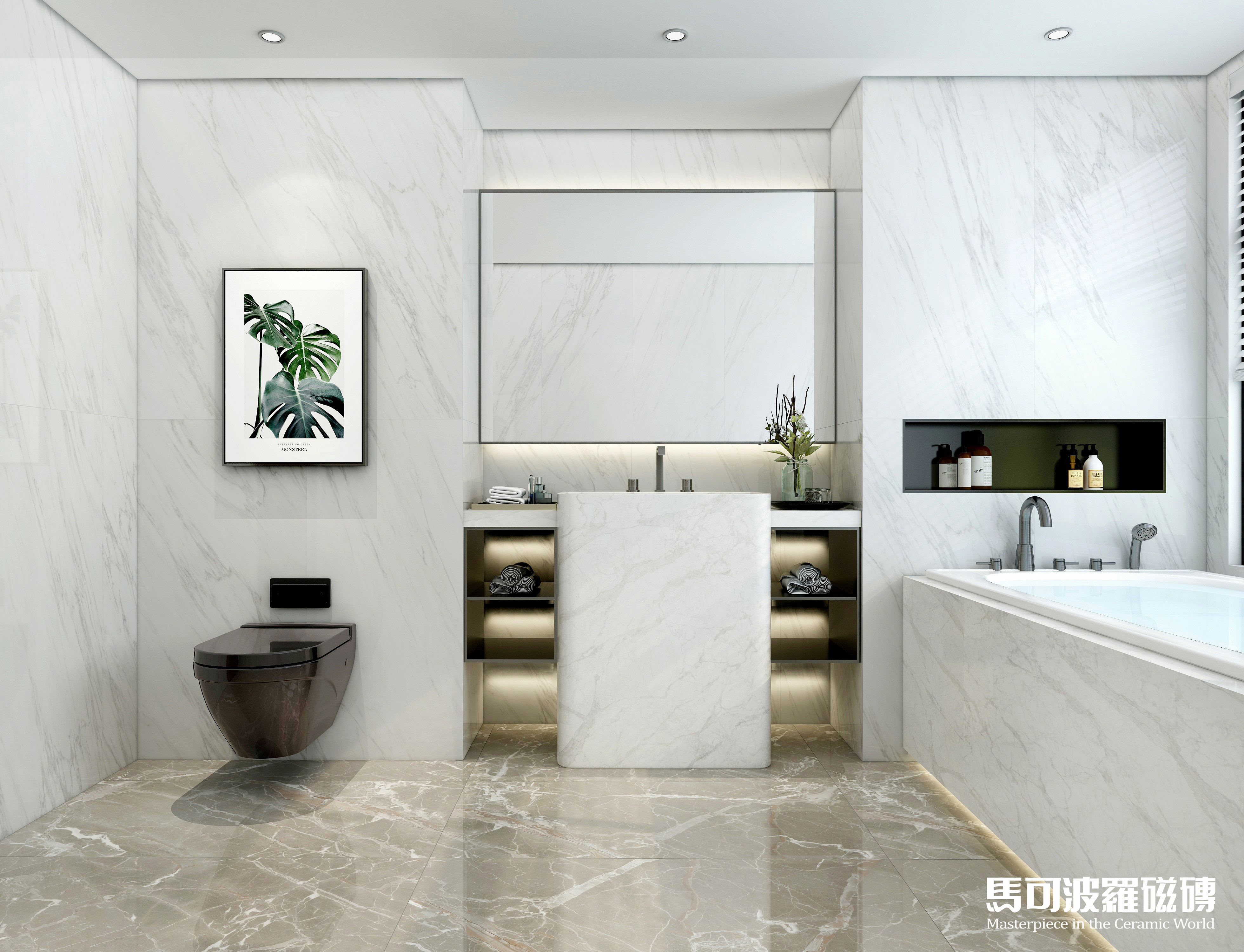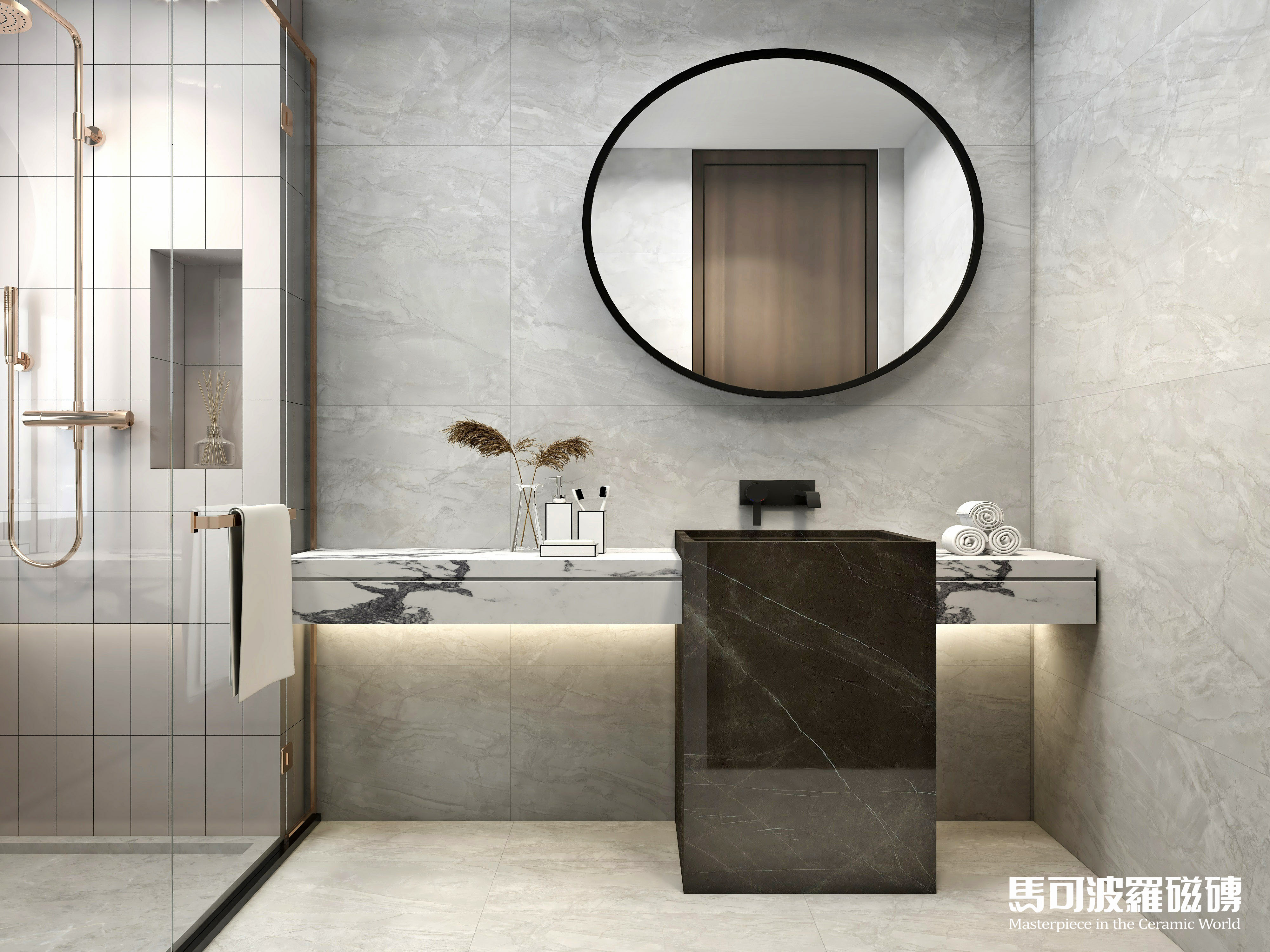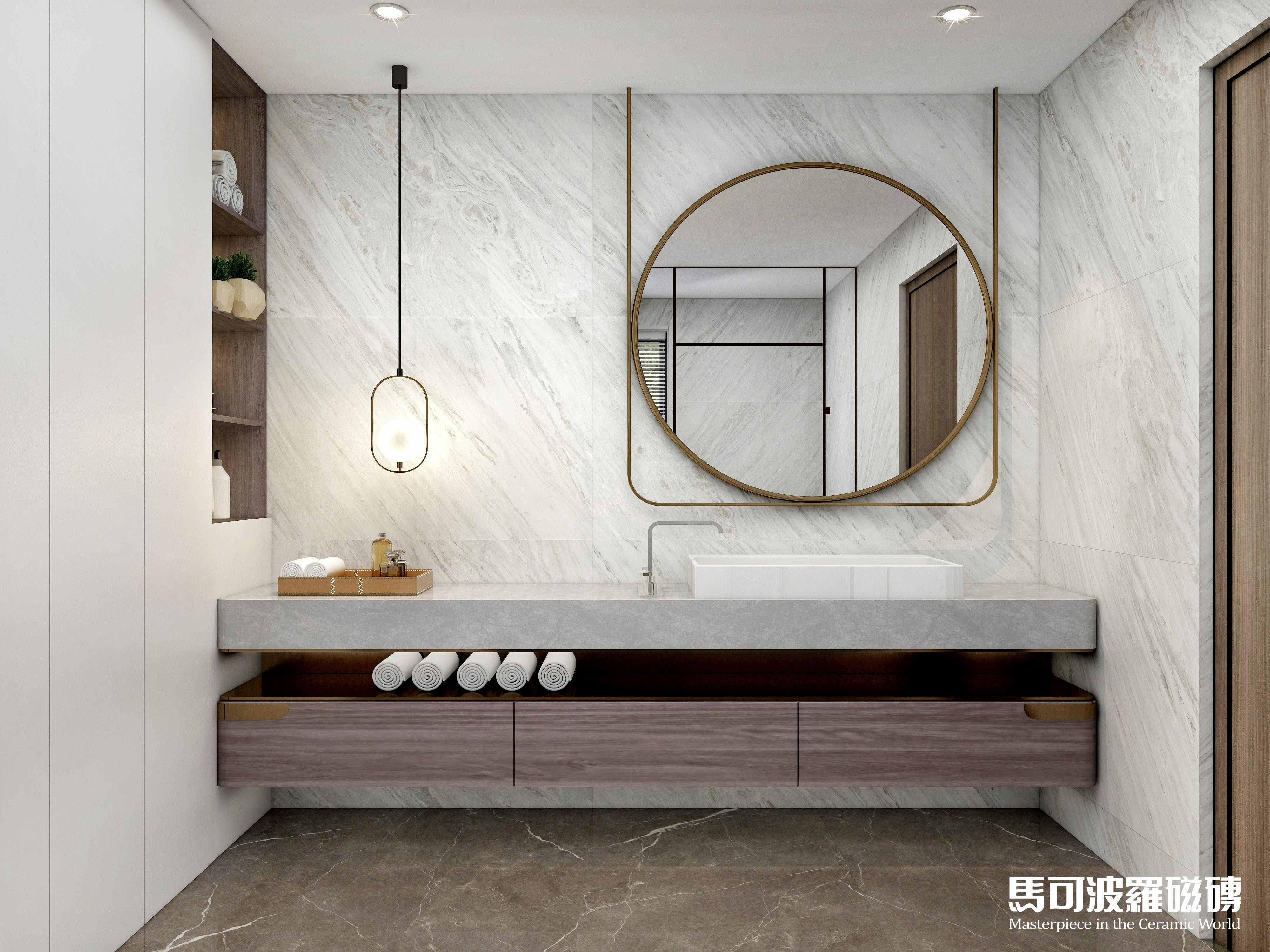 不信?小马哥马上来给大家演示演示!在层高为2.4米的卫生间中,五款不同花色的750×1500mm规格马可波罗大板将如何演绎?快往下看吧,保证好看又实用!