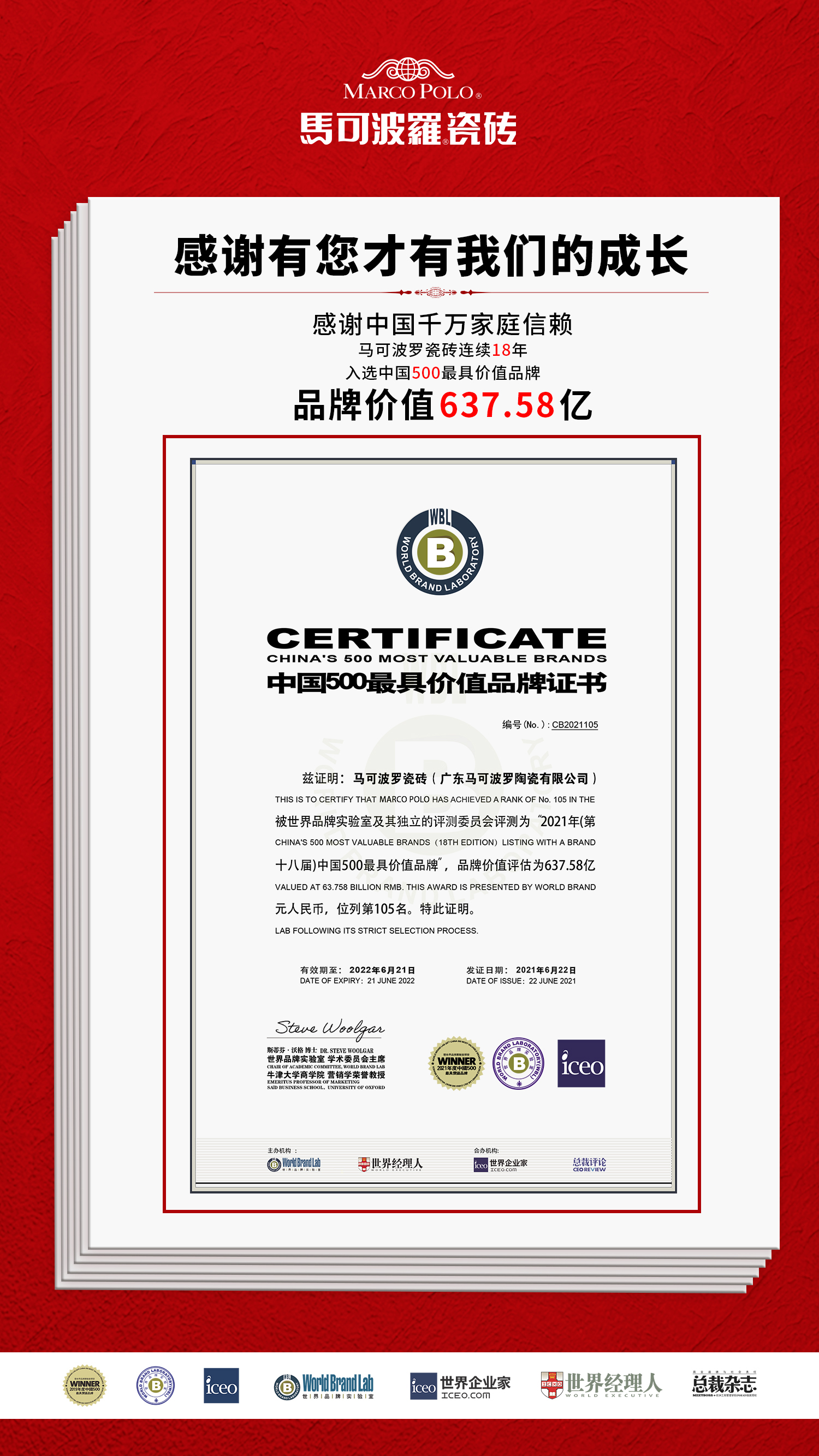 世界品牌实验室连续18年发布的“中国500最具价值品牌”,见证了无数中国品牌的砥砺奋进,见证了马可波罗瓷砖以品牌引领企业高质量发展的每一步征程。