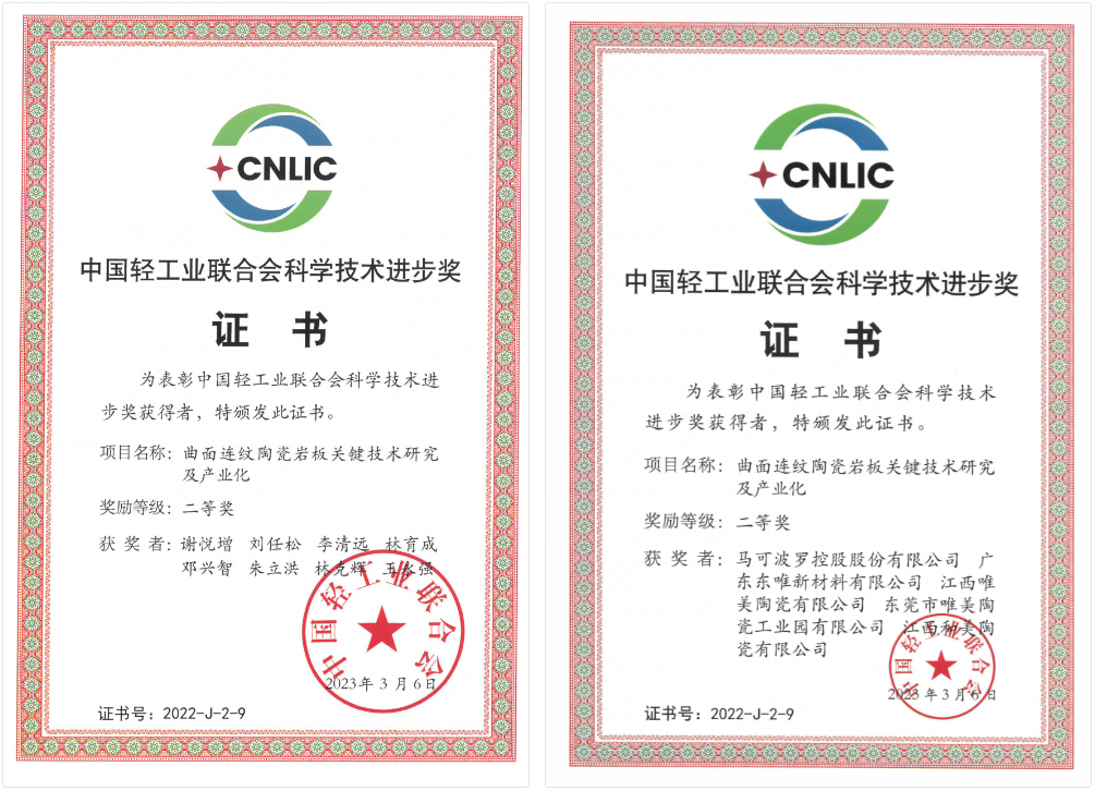 近日,中国轻工业联合会五届三次理事会在厦门隆重召开,会上颁发了2022年中国轻工业联合会科学技术奖。由马可波罗控股自主研发的“曲面连纹陶瓷岩板关键技术研究及产业化”项目荣获2022年度中国轻工业联合会科学技术进步二等奖。