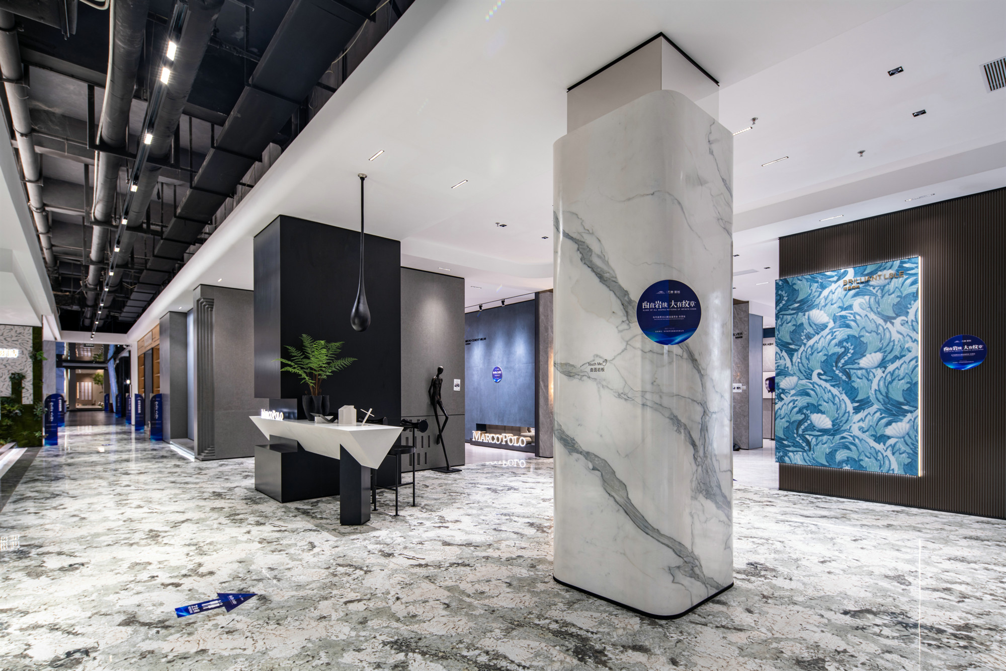 马可波罗曲面连纹陶瓷岩板,在6mm、9mm、12mm等不同厚度均可实现弯曲成不同半径曲面的极限可能,最小弯曲半径可达110mm,且任意弯曲造型均可实现连纹拼接,可广泛用于圆柱、方柱、凹面、凸面的装饰装修,为空间美学设计提供了无限可能。