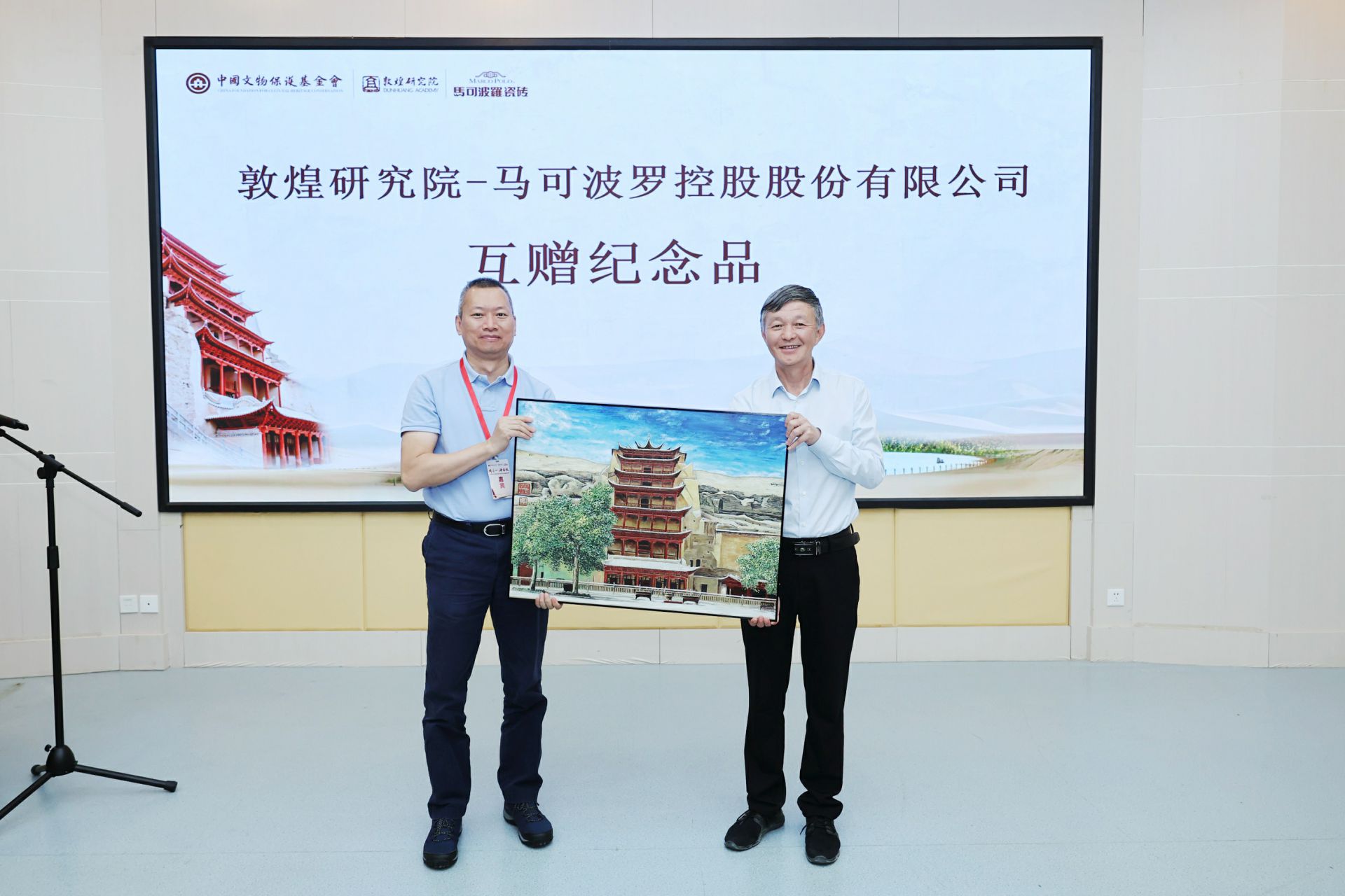 敦煌研究院院长苏伯民、马可波罗控股总裁谢悦增分别代表敦煌研究院、马可波罗控股股份有限公司互赠纪念品。谢总代表公司向敦煌研究院赠上了由中国建筑陶瓷博物馆出品的文化雕刻砖《敦煌莫高窟九层楼》。