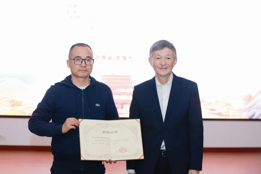 马可波罗控股营销中心市场部总监许小勇代表公司接收捐赠证书并回赠敦煌研究院马可波罗手工雕刻砖纪念品