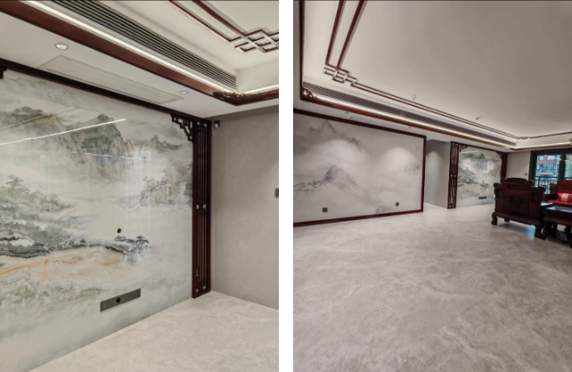 此次回访的客户家中,客厅背景墙选用马可波罗艺术岩板翡翠山晓,灵动自然,纹理流畅,色调淡雅,营造出悠远宁静的氛围。地面铺设的浅灰色马可波罗瓷砖质感出众,搭配自然纹理,沉稳大气,与整体中式风格相得益彰。