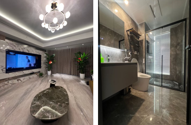郑先生家中两户160平米的户型,都选用了750×1500mm的马可波罗瓦莱石,经典暖灰色系,无论是客厅大气铺陈,还是卧室温馨点缀,都能营造出舒适而宜人的家居氛围。
