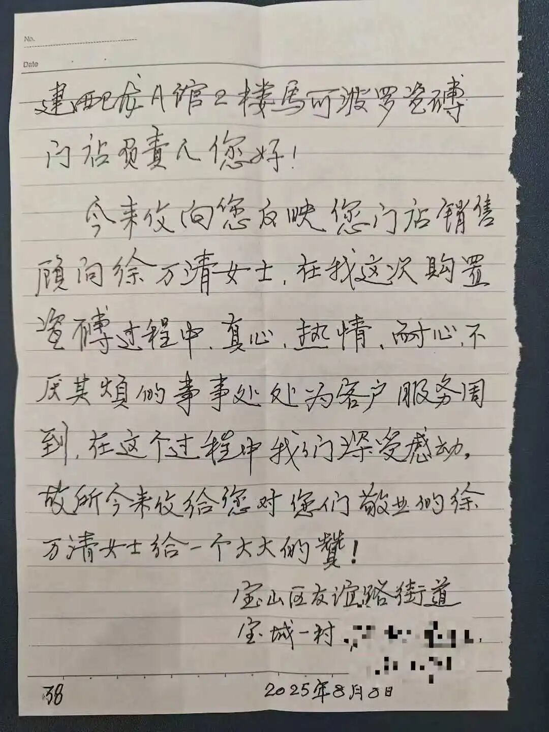 近日,上海马可波罗瓷砖团队收到了一封来自客户金先生的手写感谢信。信中,金先生对服务团队专业细致、积极负责的服务态度表达了高度认可与诚挚感谢。