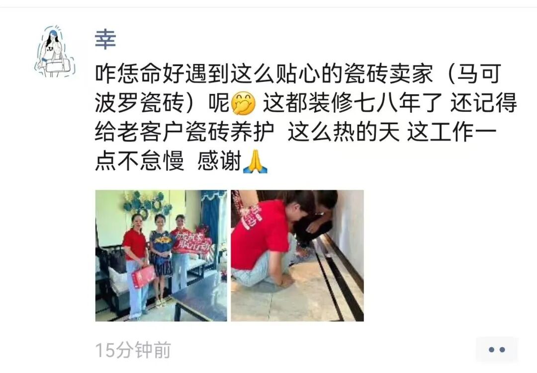 王女士表示,马可波罗瓷砖不仅产品优质,服务更是细致周到,因此她毫不犹豫地向亲戚朋友推荐了马可波罗瓷砖。回访结束后,她在朋友圈分享了这次的经历,表达了对马可波罗瓷砖真诚服务的感谢。