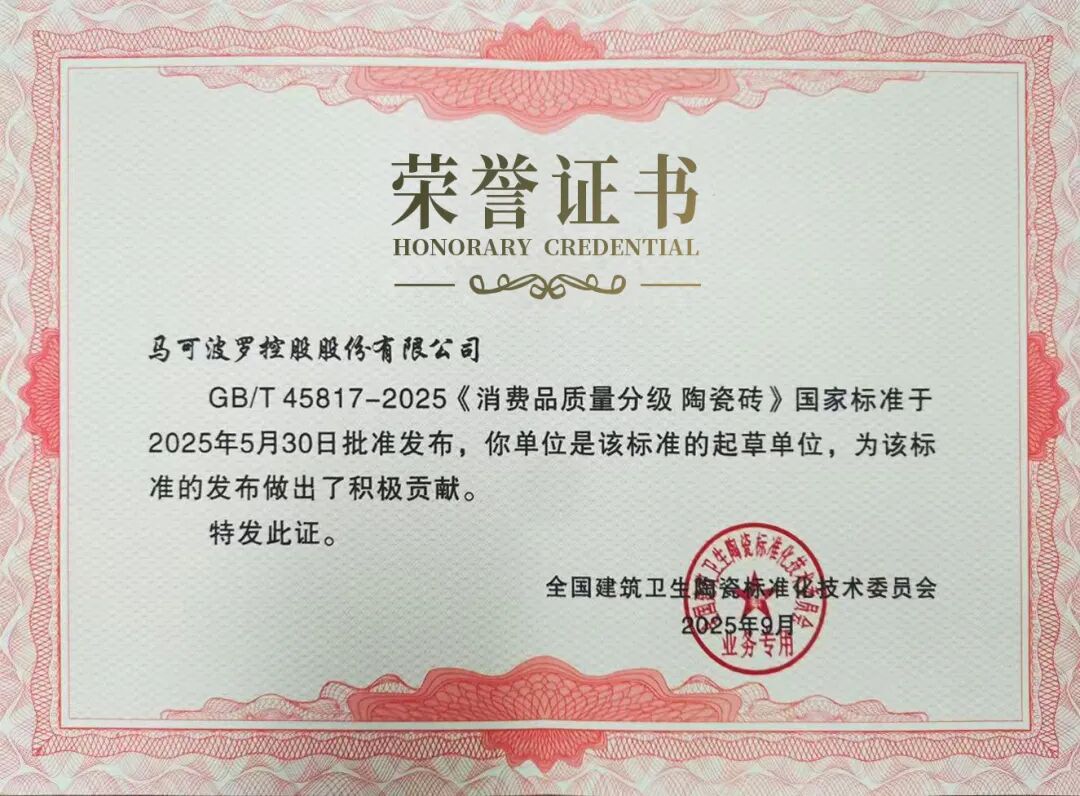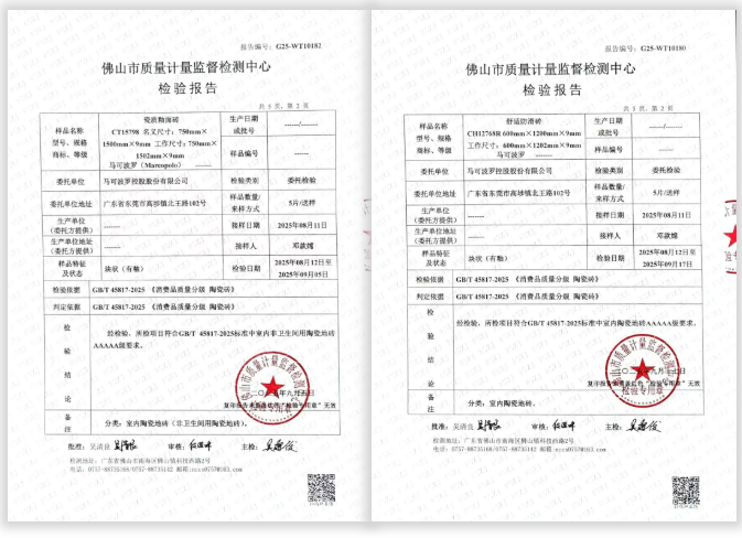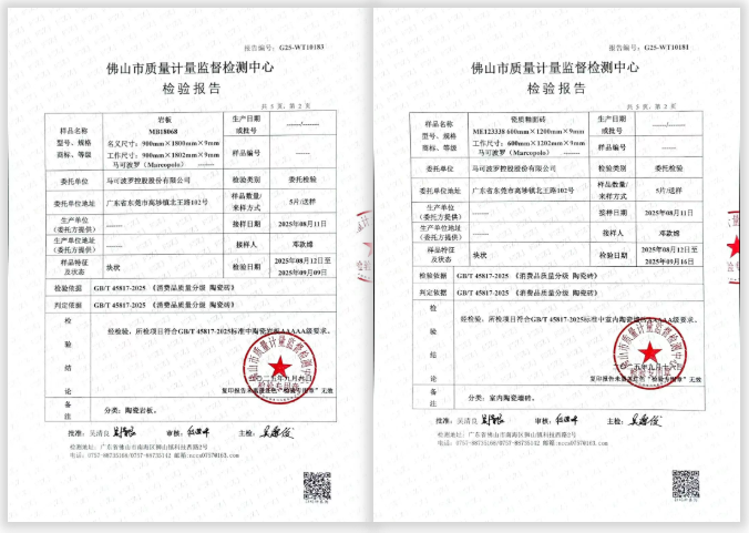 中国国检集团严格遵循新国标GB/T 45817-2025《消费品质量分级 陶瓷砖》与CTC-TVC-0P25/1.0《产品质量分级认证实施规则 陶瓷砖》权威标准,对马可波罗旗下的室内地砖、室内墙砖、陶瓷岩板产品,开展了全方位的专业检测。最终,马可波罗瓷砖成功获得中国国检集团颁发的“产品质量分级认证证书”AAAAA级最高品质认证,充分彰显产品卓越性能。